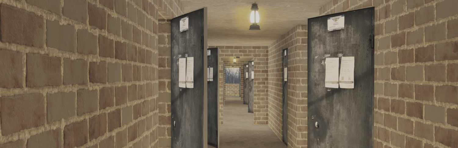 - Multi-story brick buildings with interior corridors, stairwells, and defensive firing positions