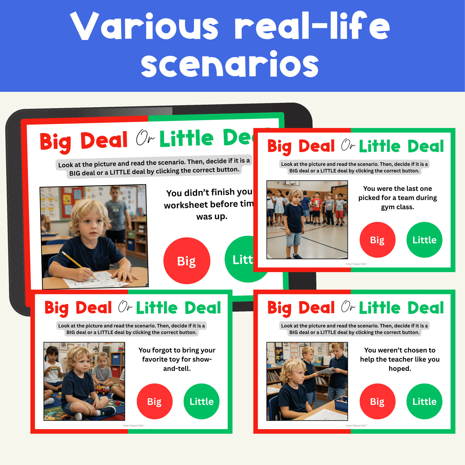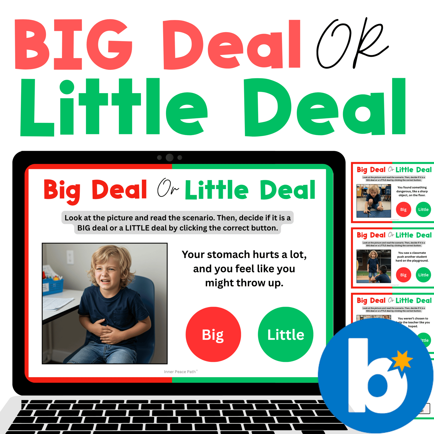 Students will look at realistic pictures and read short scenarios featuring a consistent character, then decide if the situation is a big deal or a little deal. Great for SEL lessons, coping skills, and classroom behavior support!