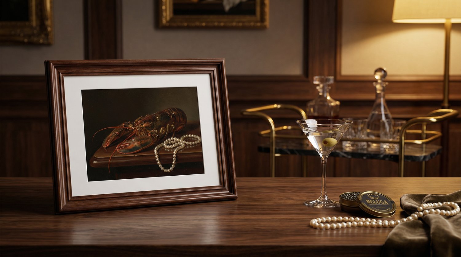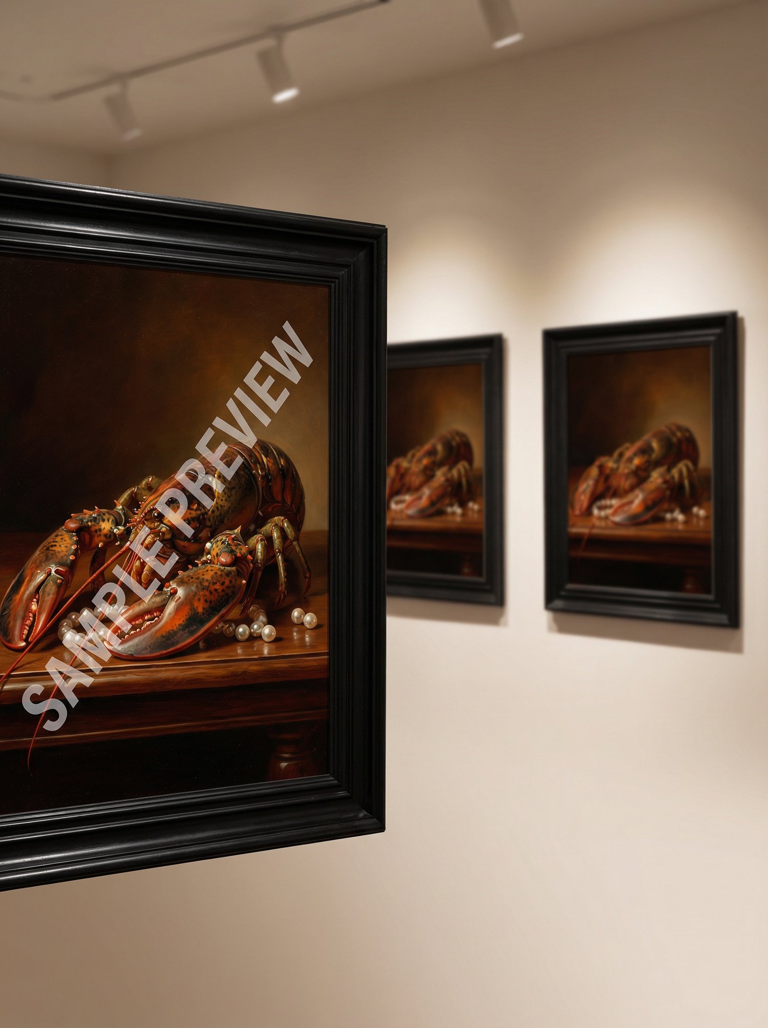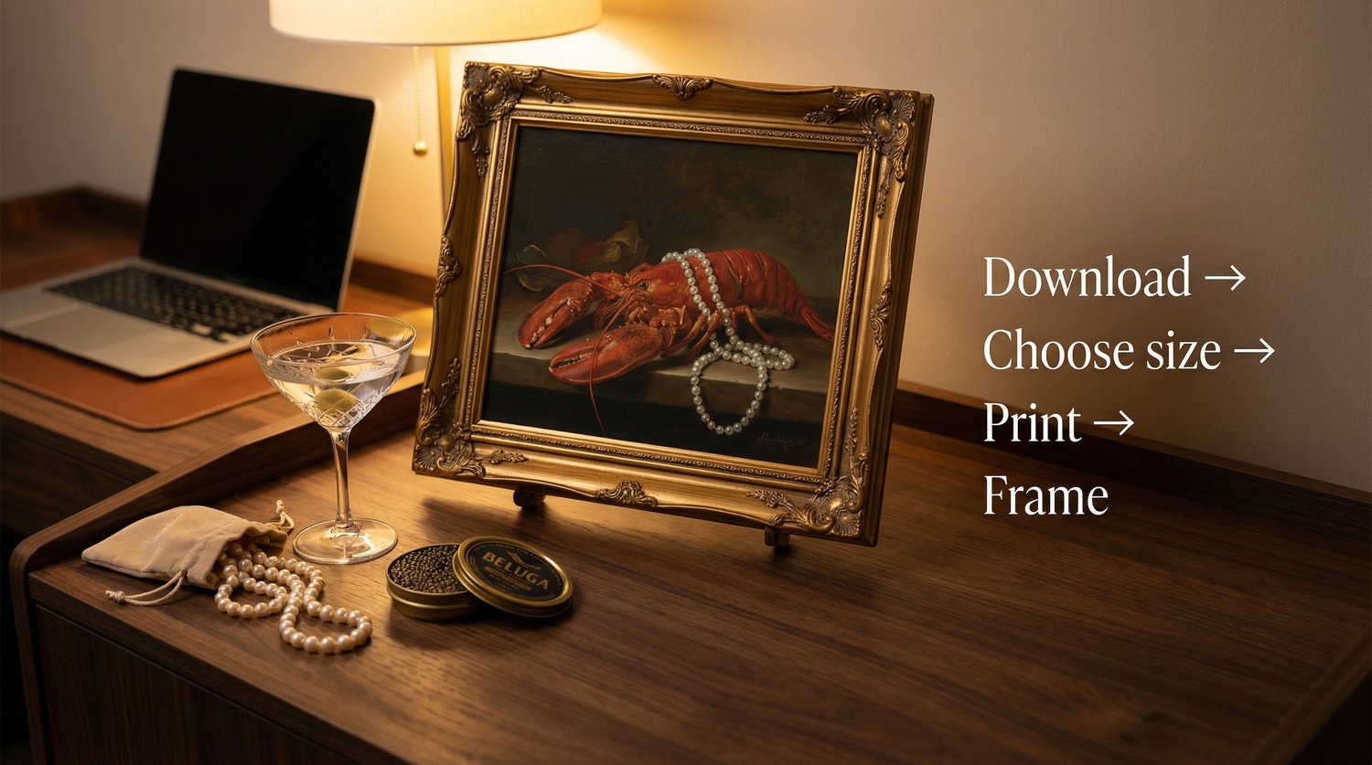 A collectible surreal still-life oil painting: a lobster draped in pearls under warm museum lighting—designed to feel like a gallery piece, delivered as a high-resolution printable set.