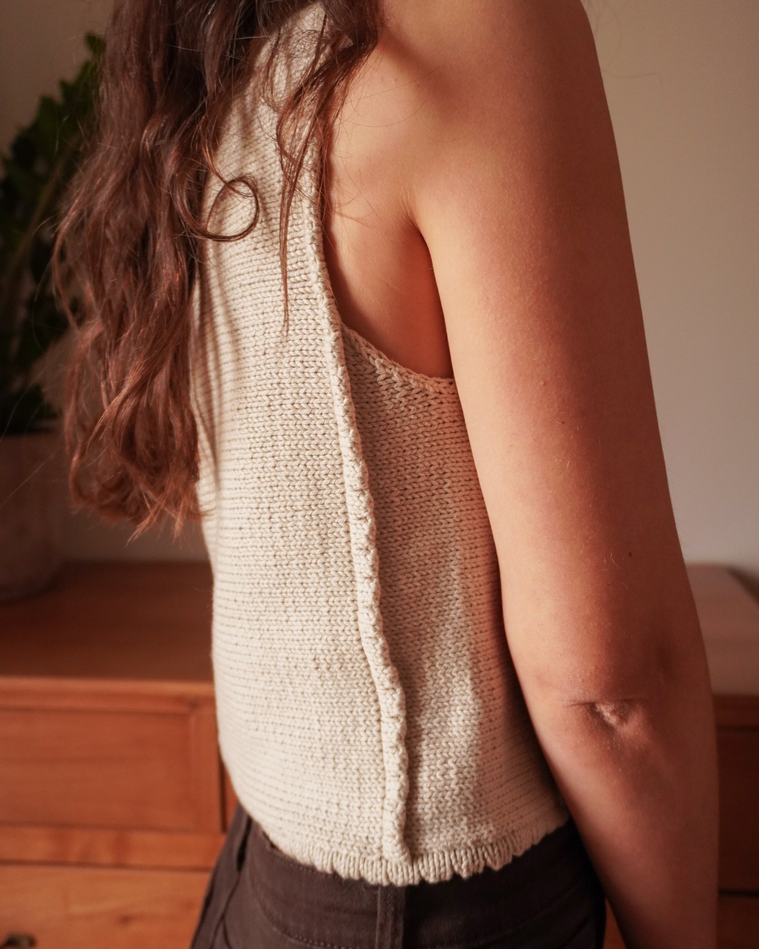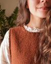 The Petali Slipover is a versatile garment that can be elegantly layered over dresses or blouses for added warmth in a woolen version or worn on its own as a summer top when worked using a plant-based yarn.