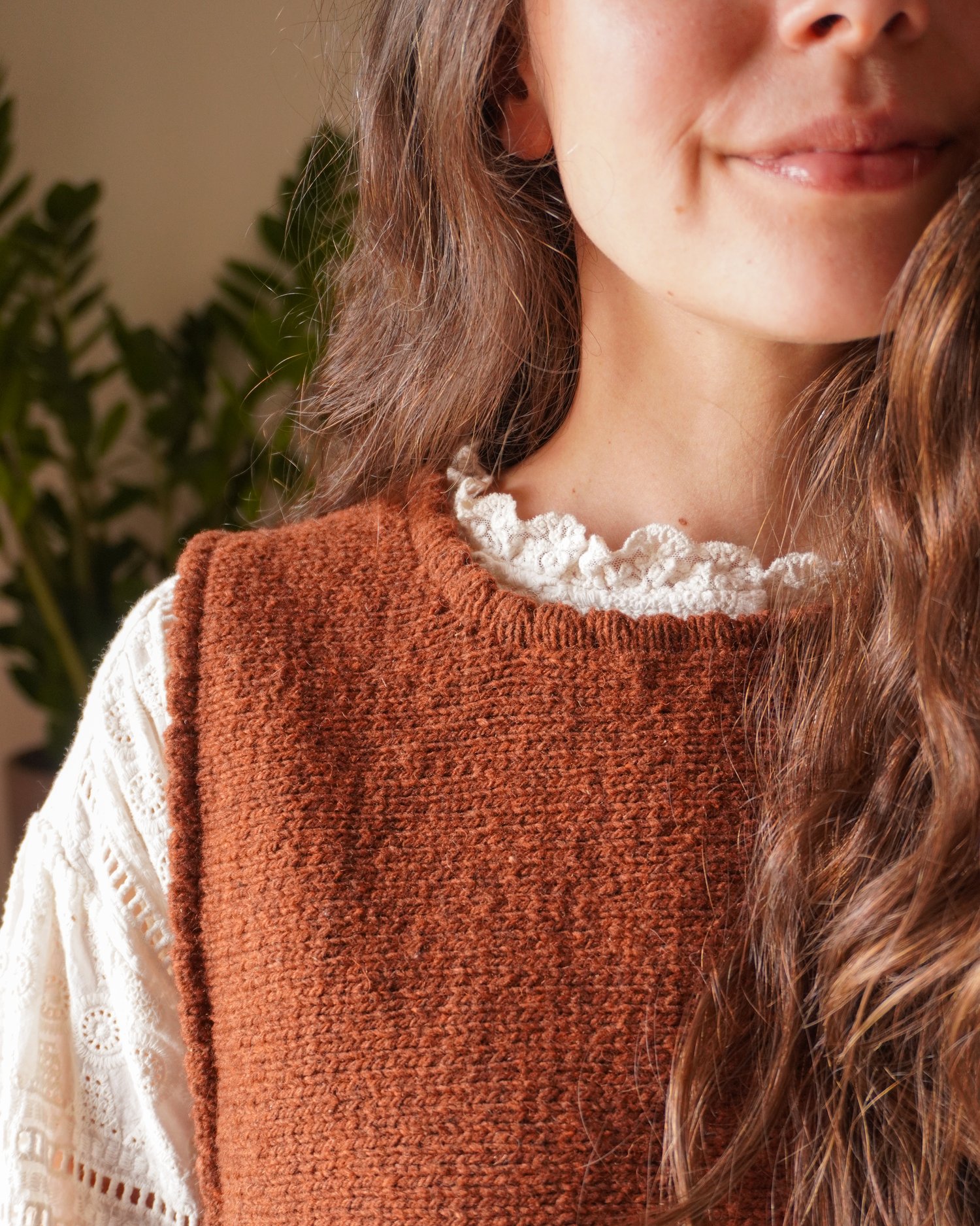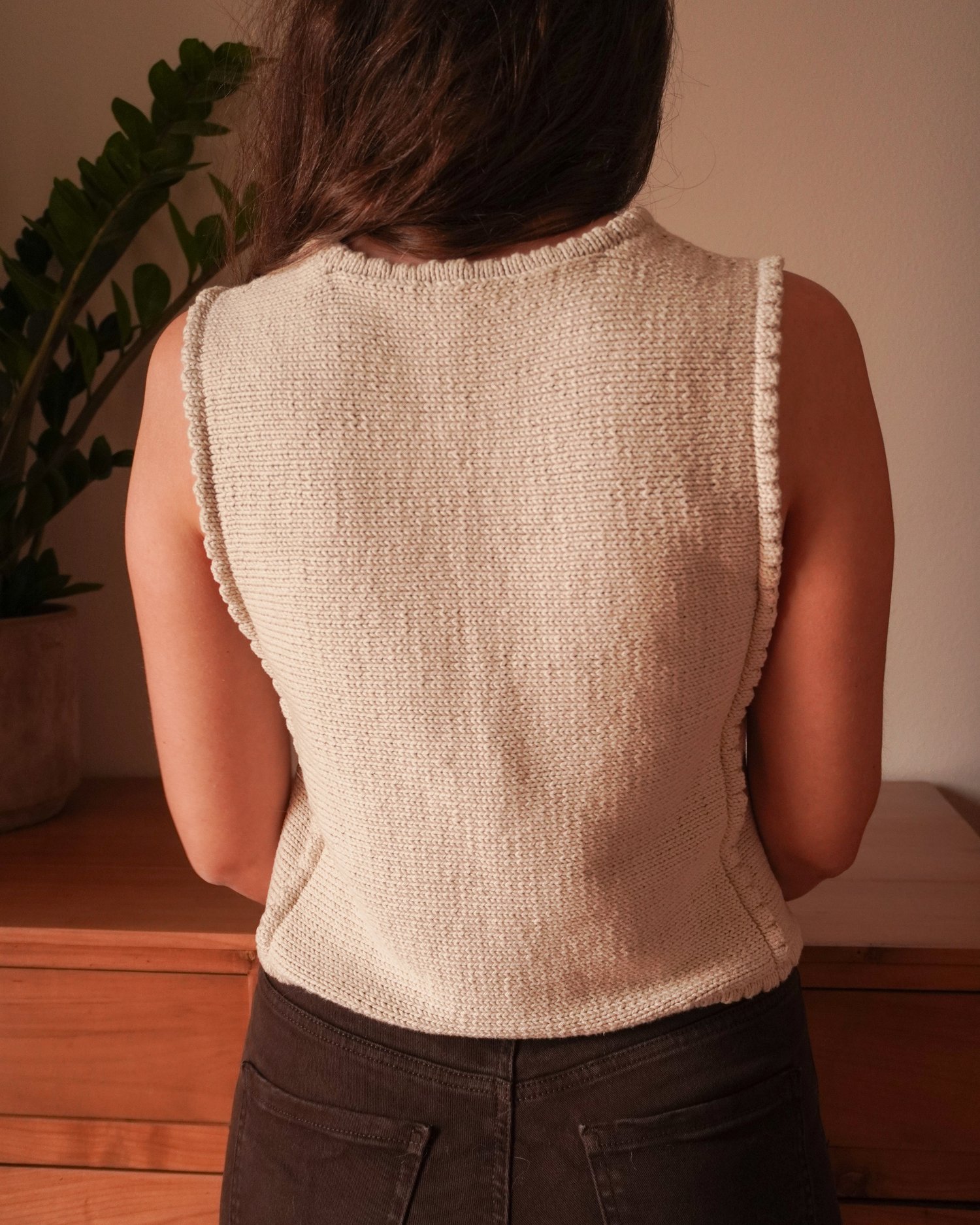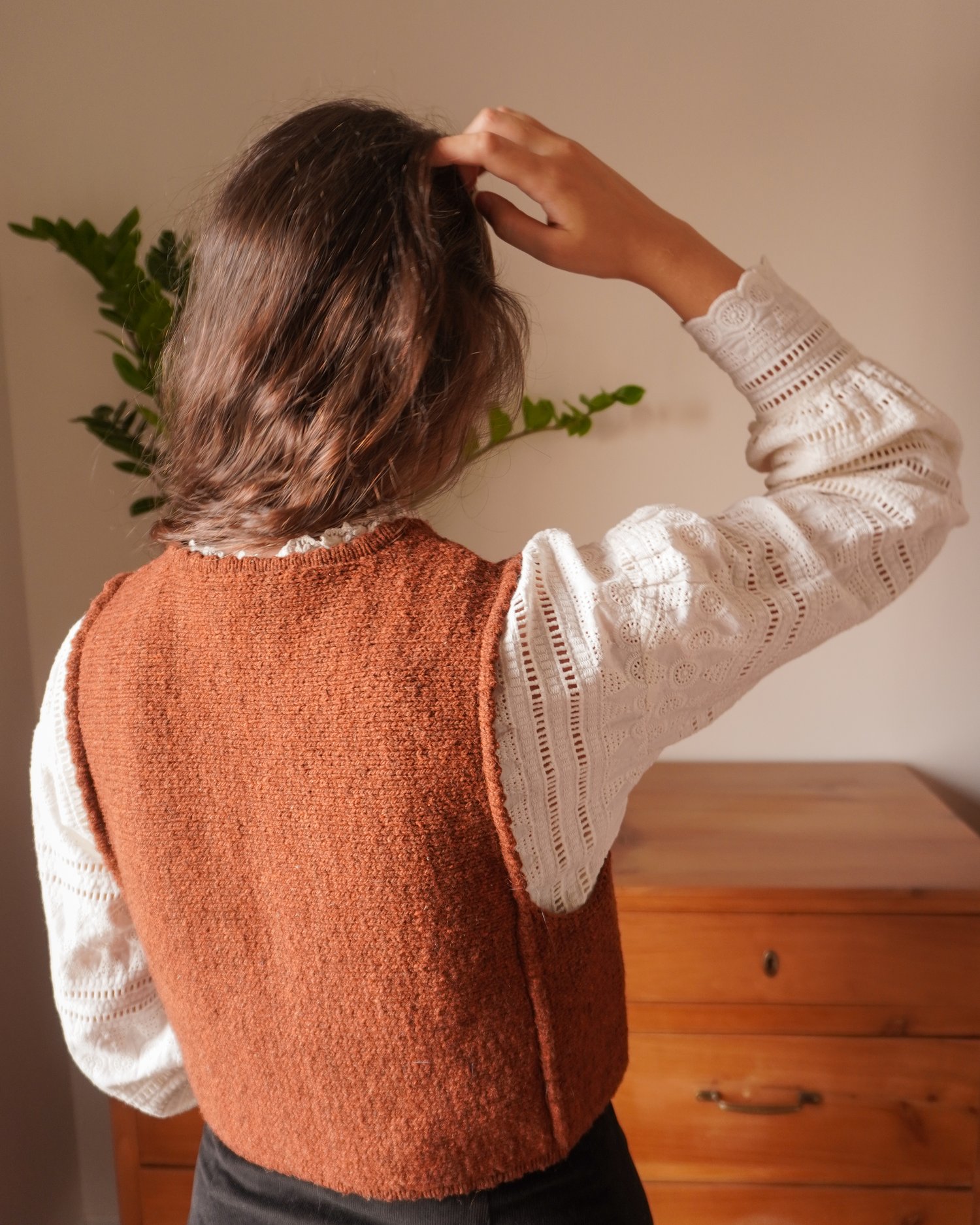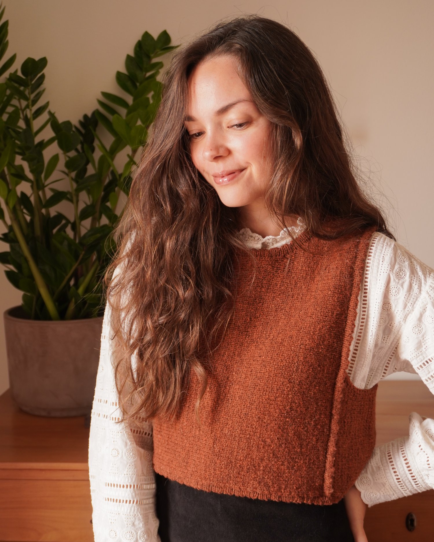 The rust sample is shown in a size 2 with 8 cm / 3.25” of positive ease on a bust of 86 cm / 34.5” in the cropped length and with deep armholes. The cream sample is shown in a size 2 with 2 cm / 0.75” of positive ease on a bust of 86 cm / 34.5” in the regular length and with regular armholes.