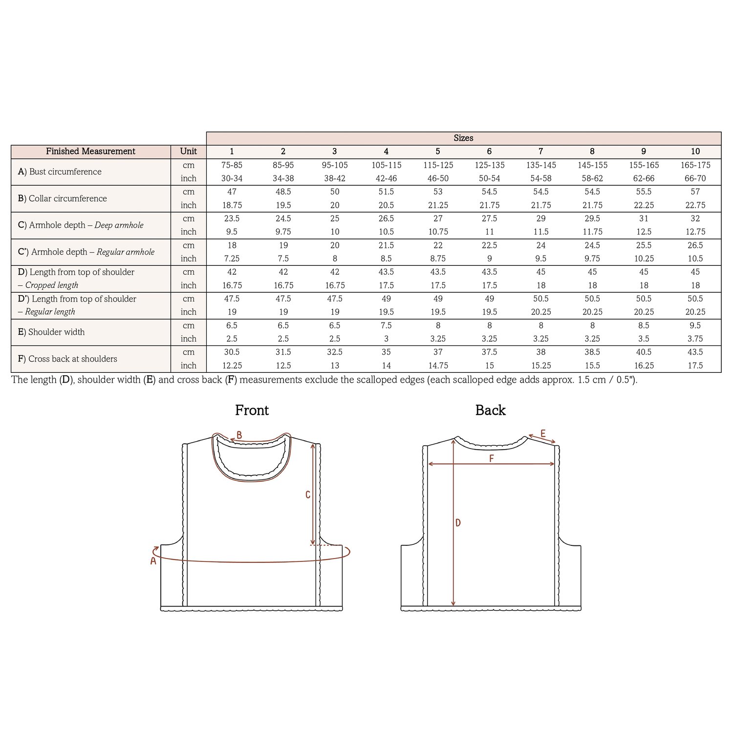Sizes 1 (2, 3, 4) 5, 6, 7 (8, 9, 10) can be worked to obtain finished bust circumference measurements (A) in the ranges indicated in the finished measurements table. See finished measurements table and schematics at the end of the pattern pictures for more information.