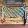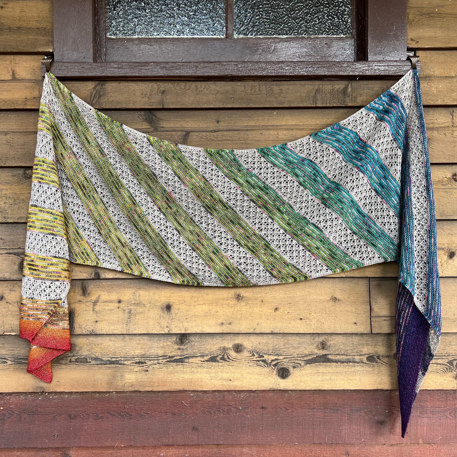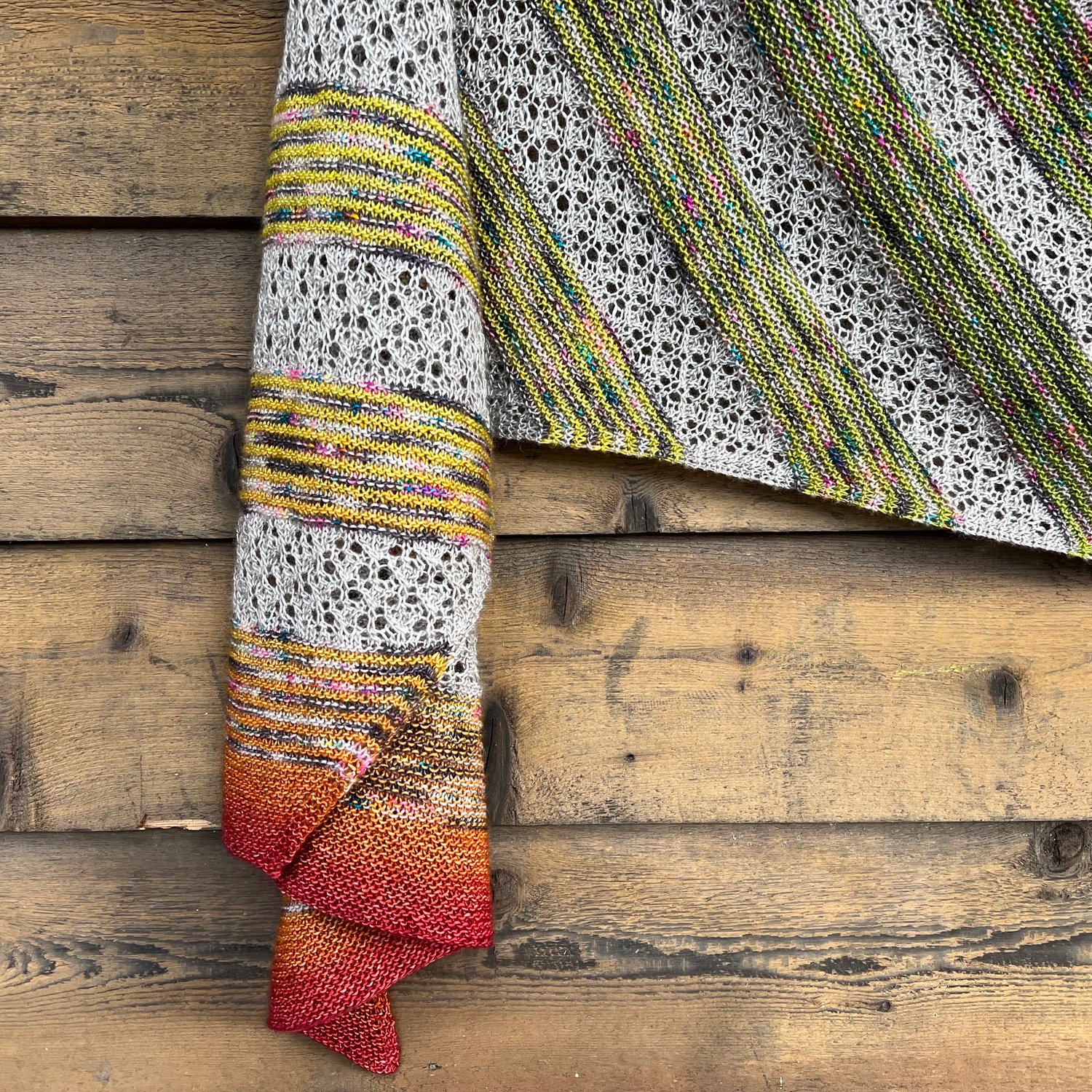 The Mountain Moon shawl is a rectangle knit on the bias with panels of garter stitch stripes alternating with simple lace. It is designed for 300g of fingering weight yarn using either a 100g/3.53oz gradient with 2 other yarns, a 200g/7.05oz gradient with 1 other yarn, or a 300g (10.58oz) gradient on its own (the pattern is written for a 100g gradient with instructions for how to use larger ones). With easy customisation to different yarn weights, widths, and lengths, this pattern is also great for handspun yarn, minis, and stash-busting projects.