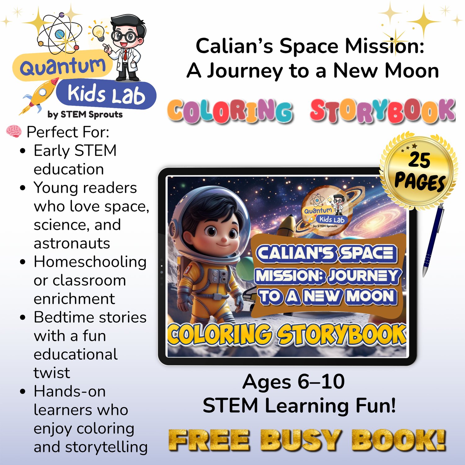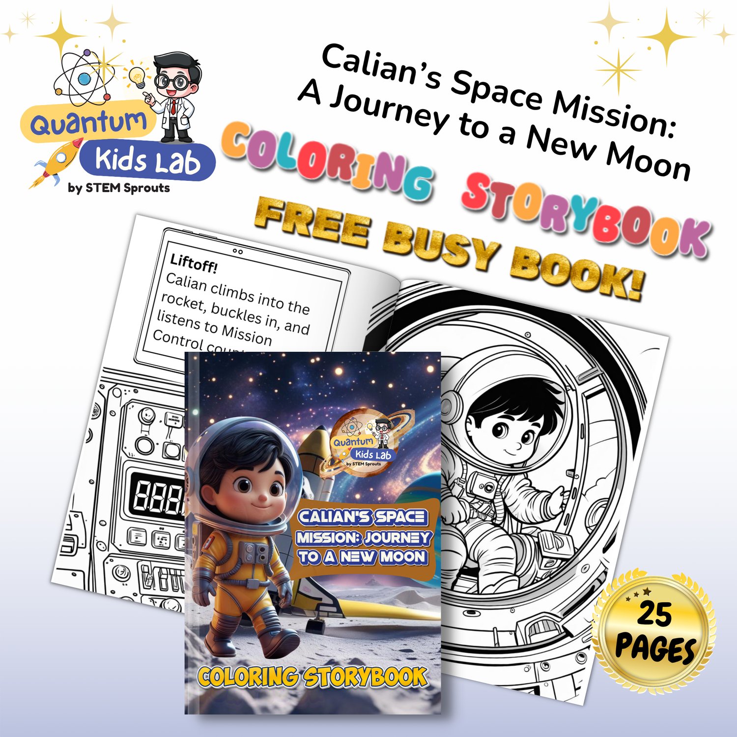 Join Astronaut Calian on a thrilling 25-page adventure to explore a mysterious new moon! This fun and educational coloring storybook blends real-life astronaut tasks with space science and physicsβperfect for curious kids ages 6 to 10.
