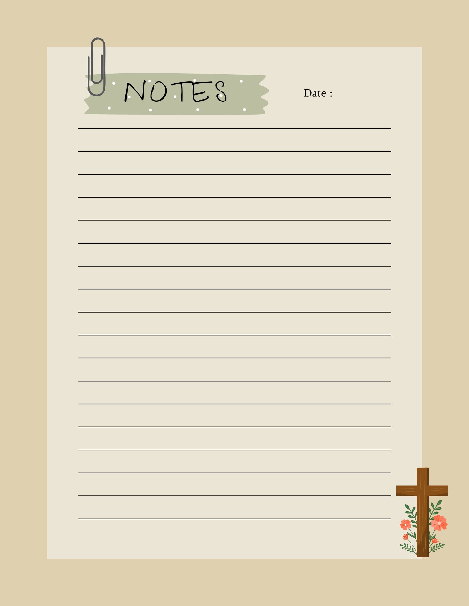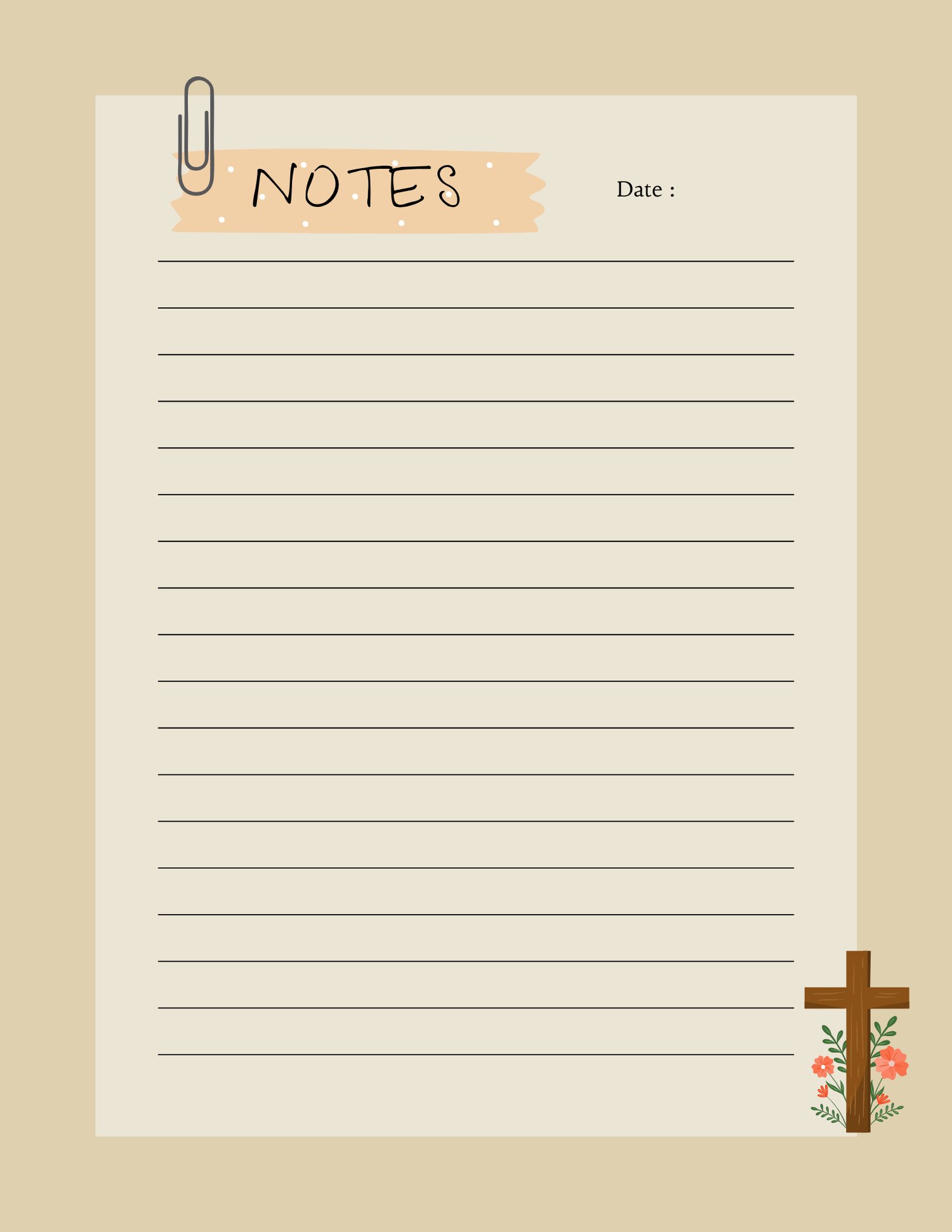 This notebook has a floral cover with a cross at the bottom of each page and color coated "Notes" sections at the top of the pages.