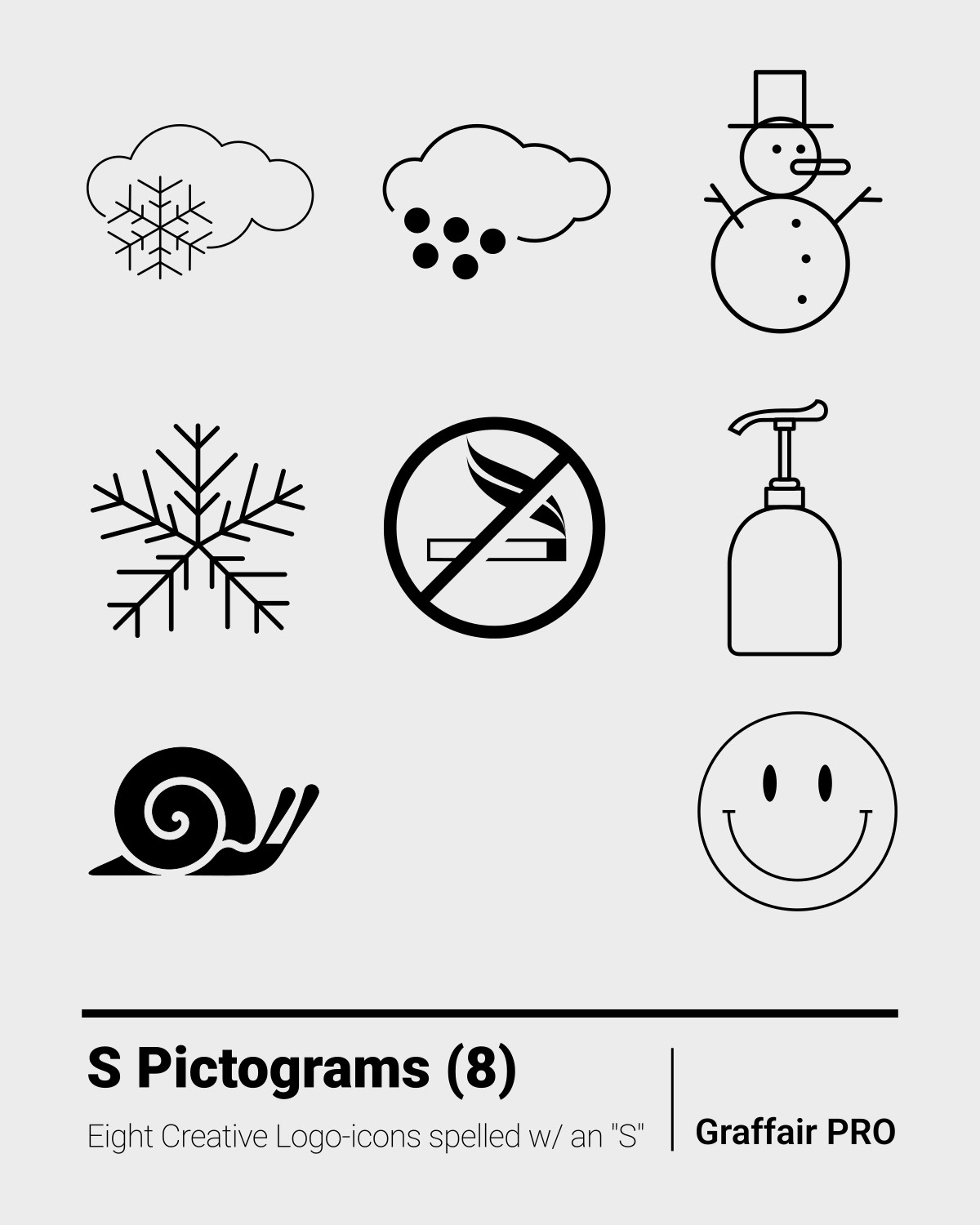 S Pictograms (8): The 8th set of 8 pictograms, each beginning with an "S".