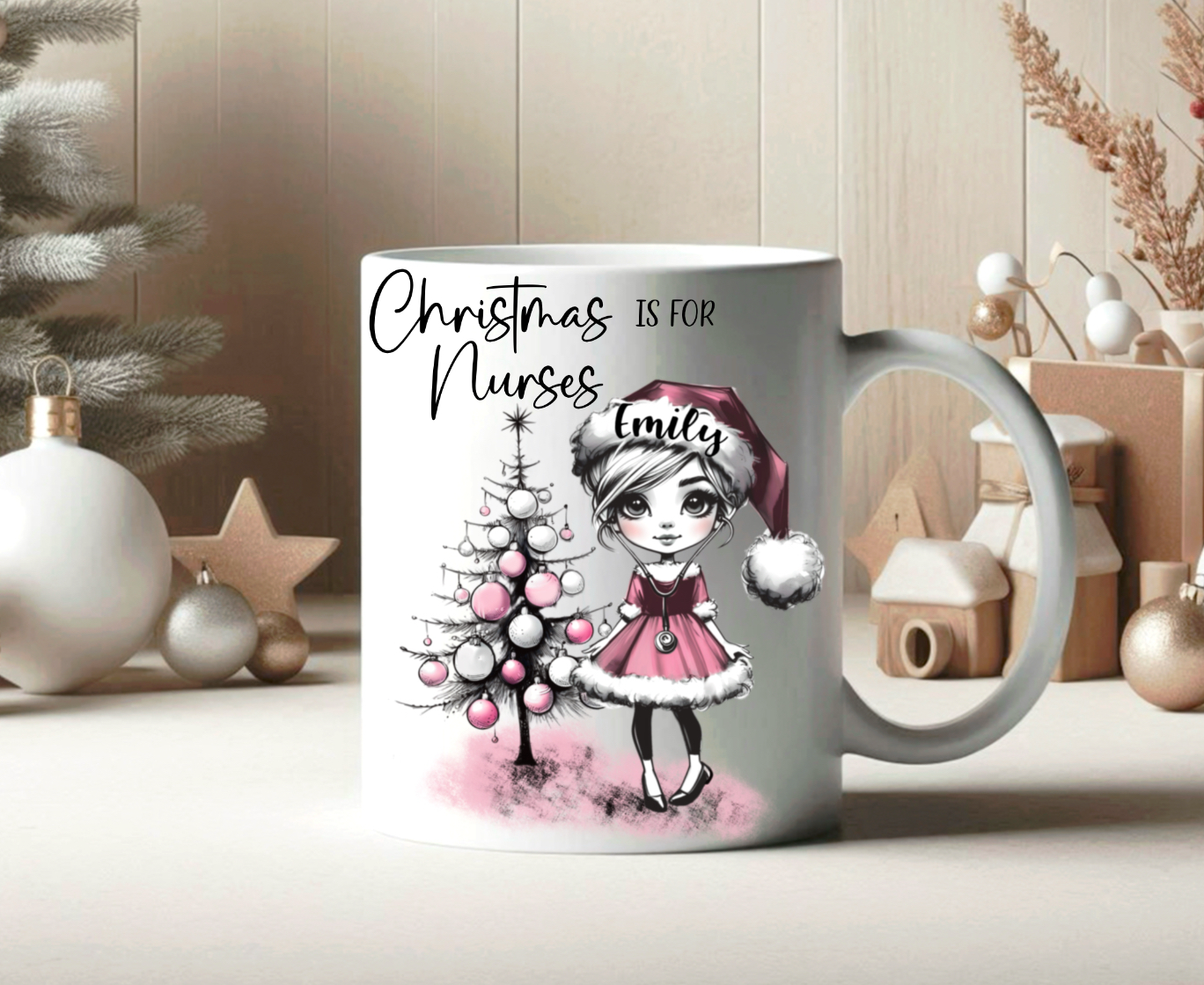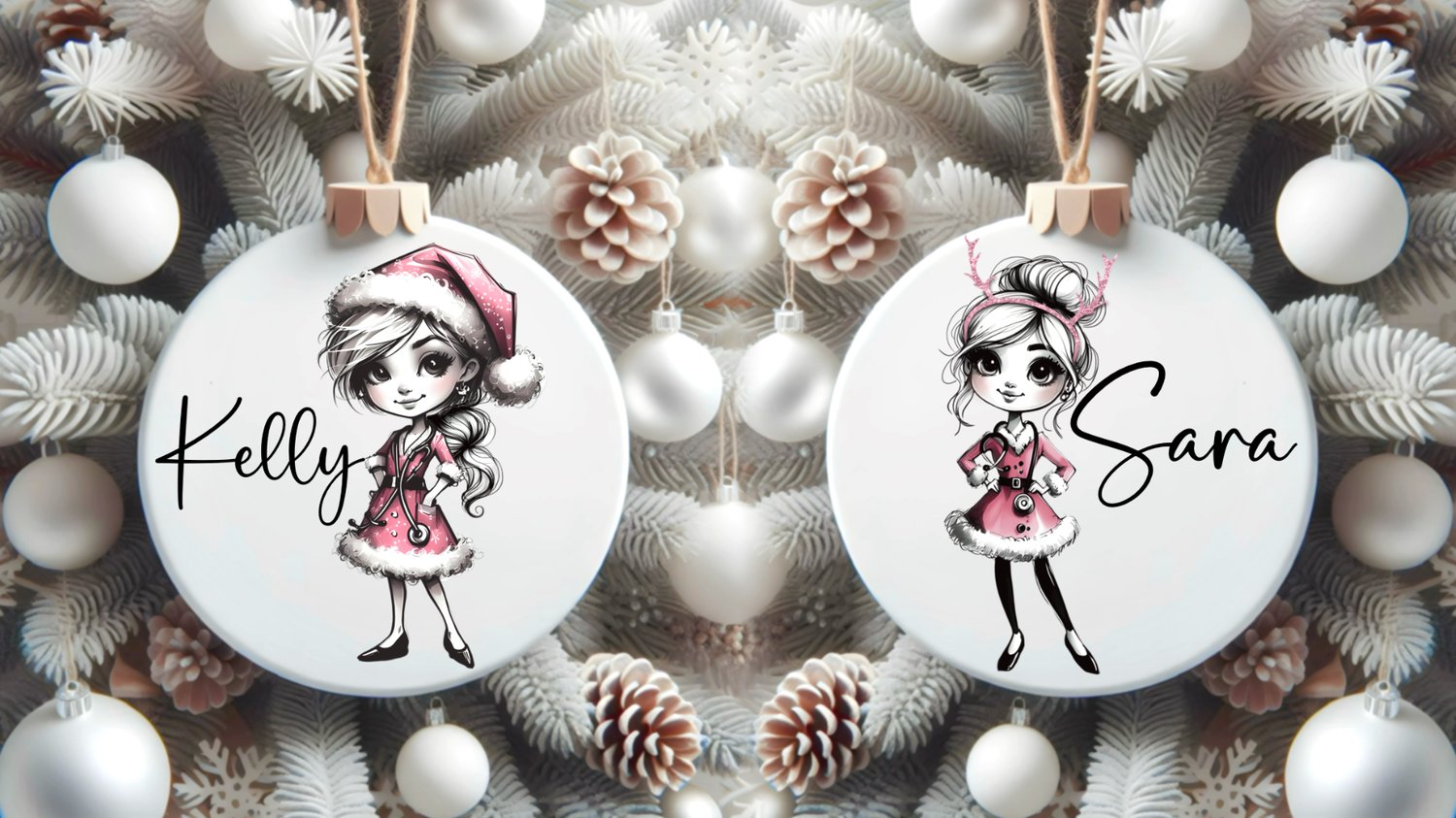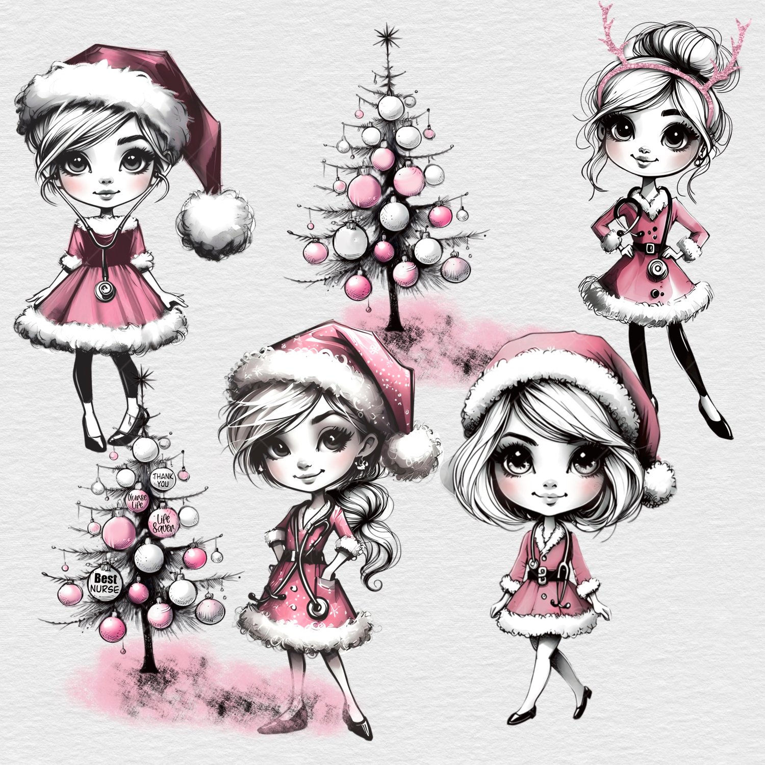 Christmas nurses. 4 Whimsical nurses with different hairstyles and 2 trees; one with and one without text. 6 PNGs. Sublimation, print, DTF etc. Instant download. ideal clothing, cards, baubles and more!