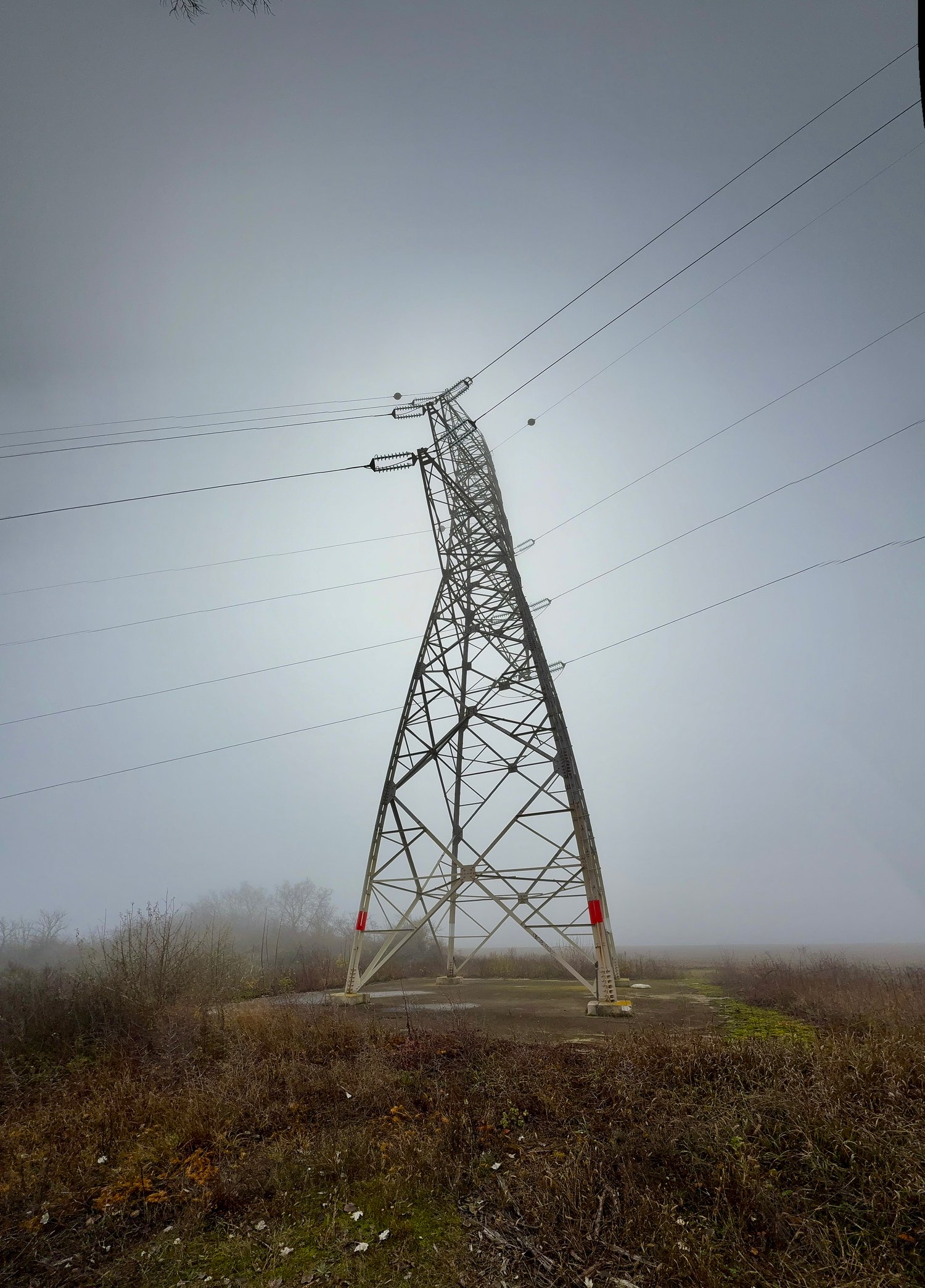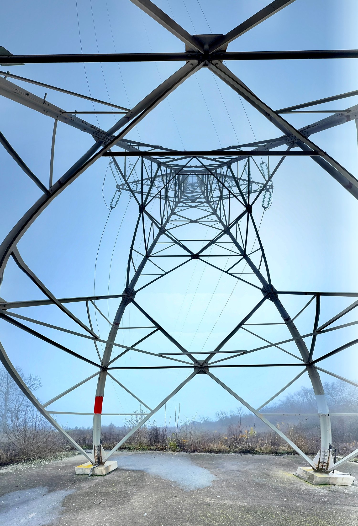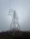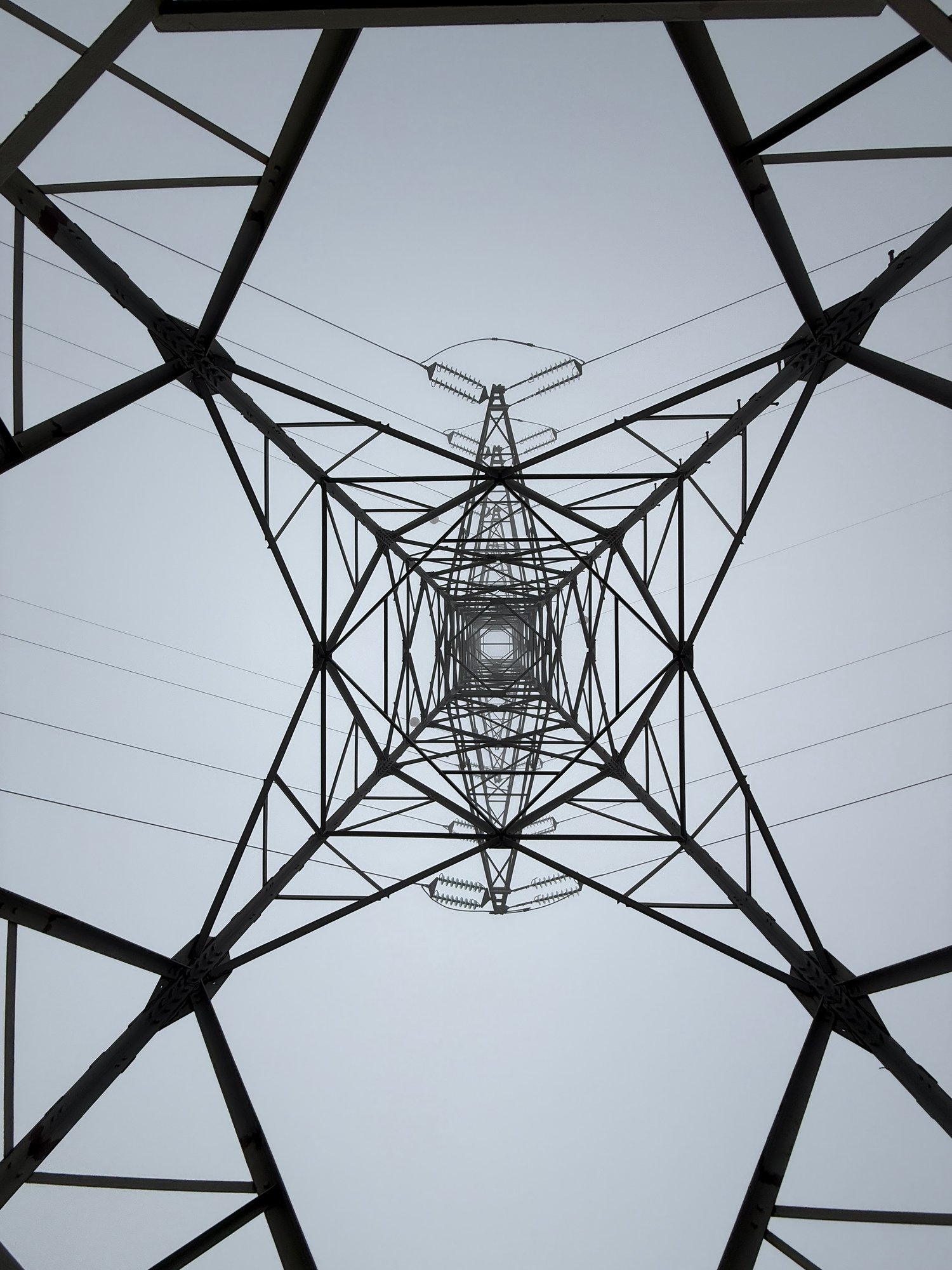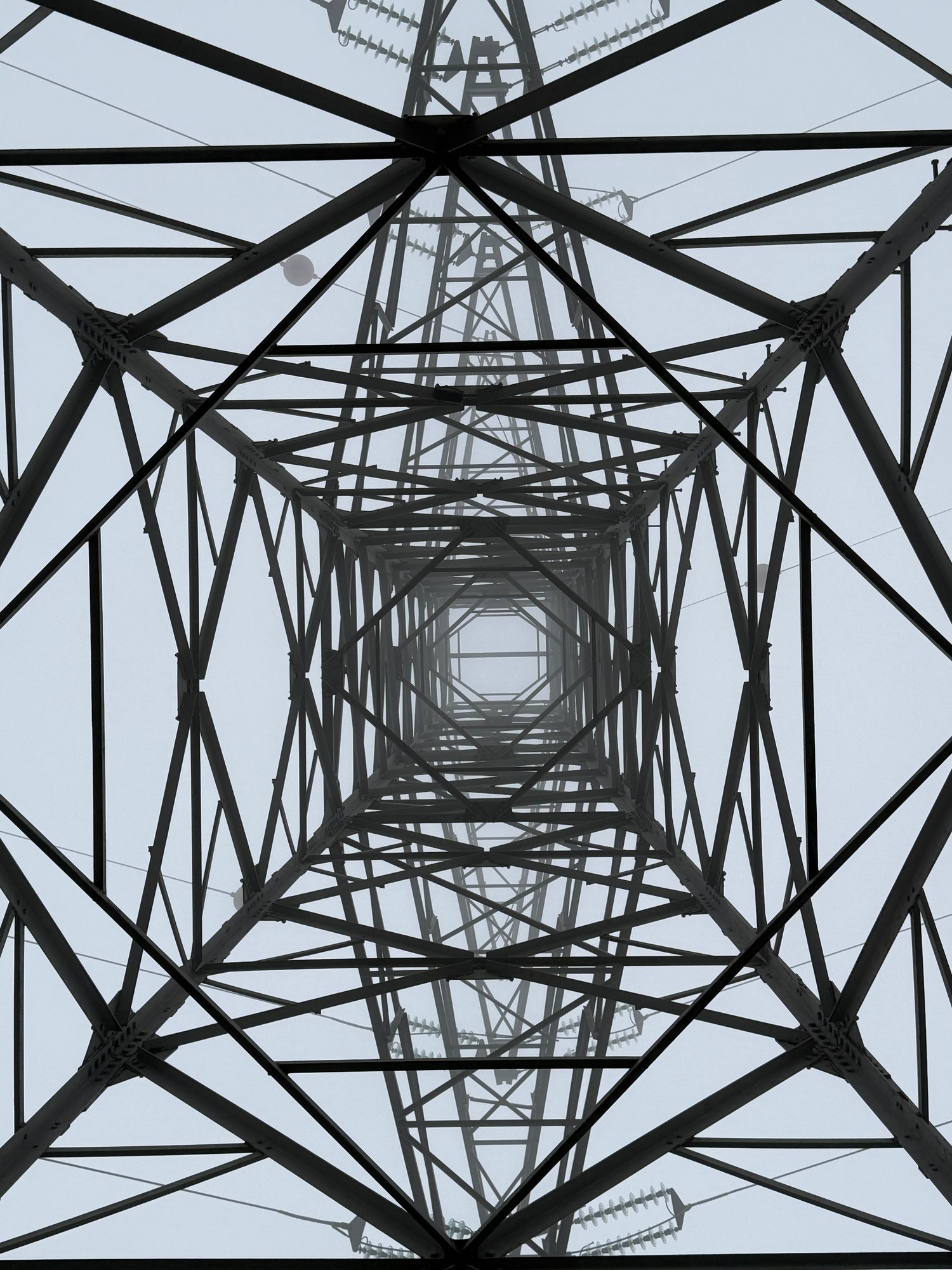 pylon, electricity, infrastructure, tower, steel, lattice, symmetry, perspective, engineering, power lines, transmission, structure, geometric, upward view, industrial, architecture, energy, grid, metal, support, urban, utility, dramatic, fog, vanishing point