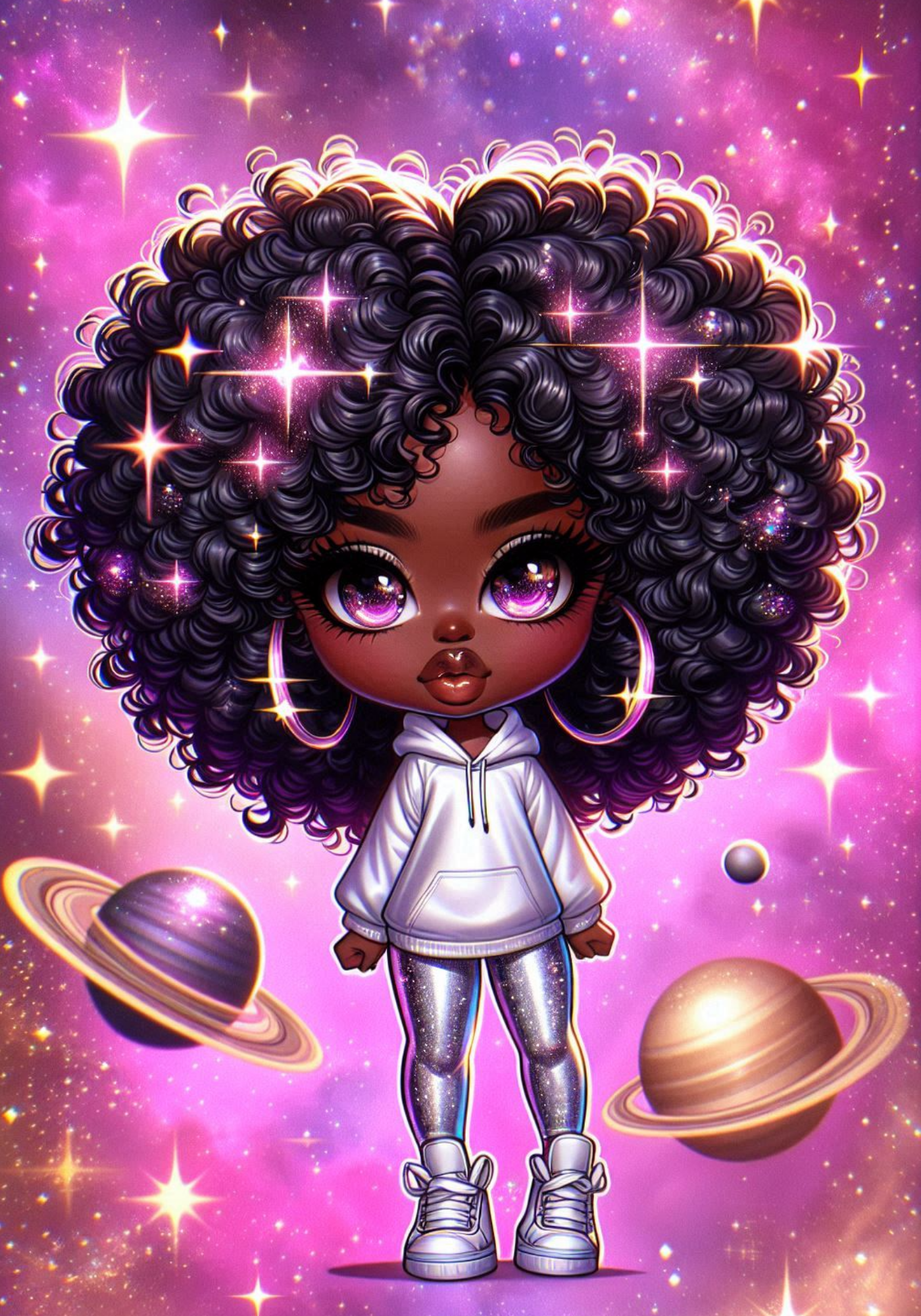 Make school days shine with this stunning custom composition notebook! Featuring a cosmic girl with a big curly afro full of sparkling stars, galaxy eyes, a white hoodie, and silver glitter leggings — this notebook brings bold style and magical energy to every assignment.