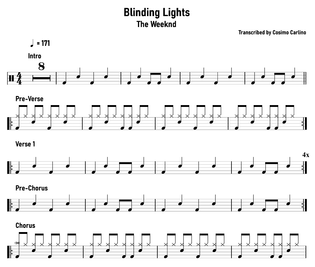 Blinding Lights - The Weeknd Full Drum Transcription in PDF