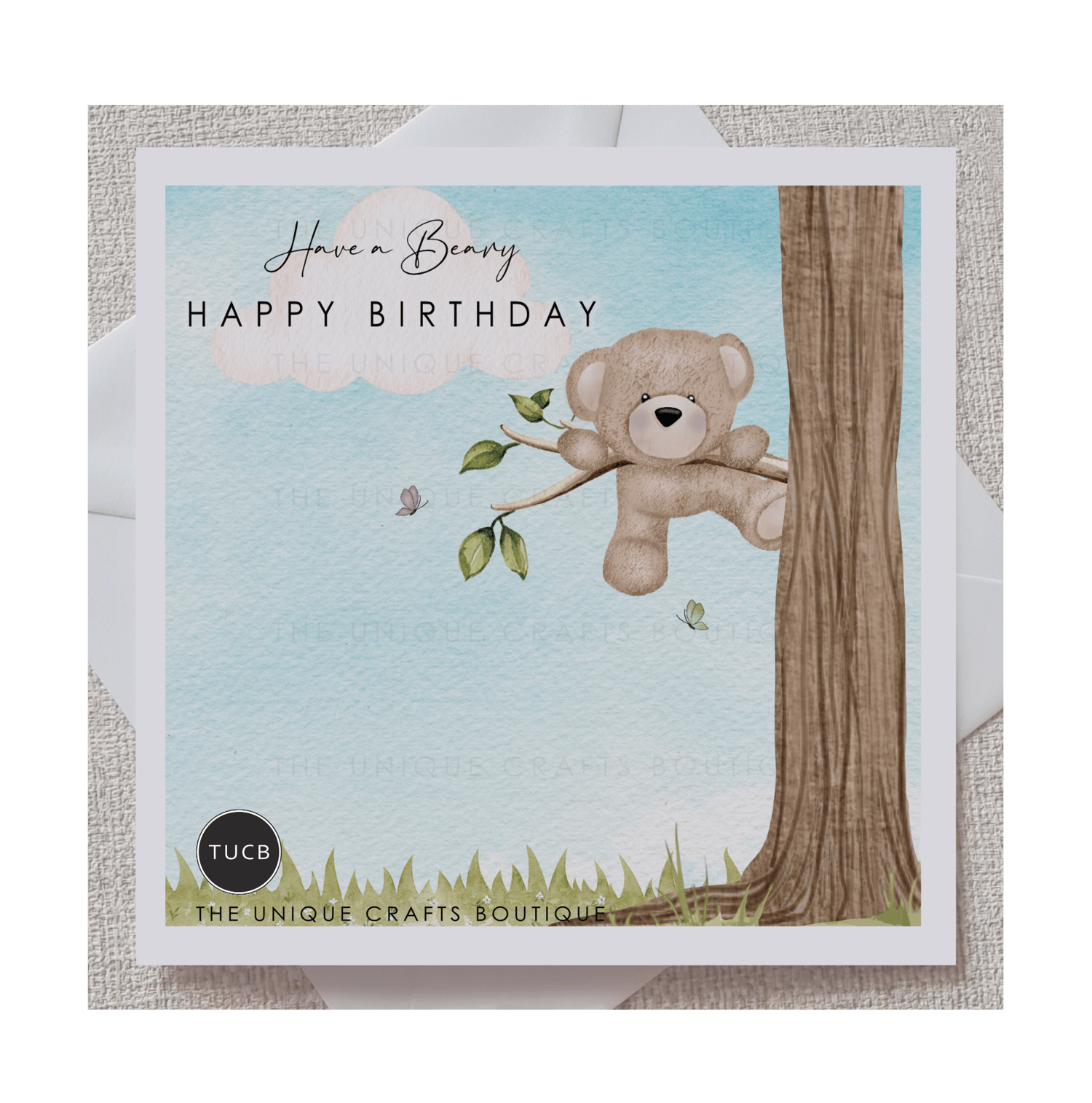 Printed with our cute Bear hanging from a branch and displaying the message, Have a Beary Happy Birthday across the top. This cute card is certain to make your loved one smile.