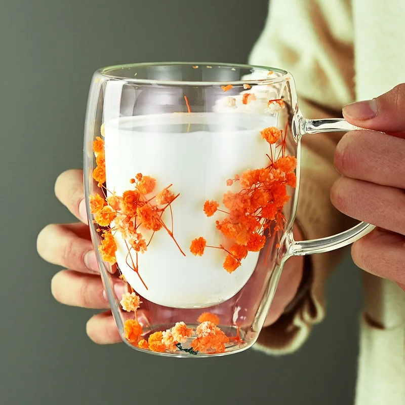 380ml Double Layer Dried Flower Glass Mug – Insulated Creative Drinkware
