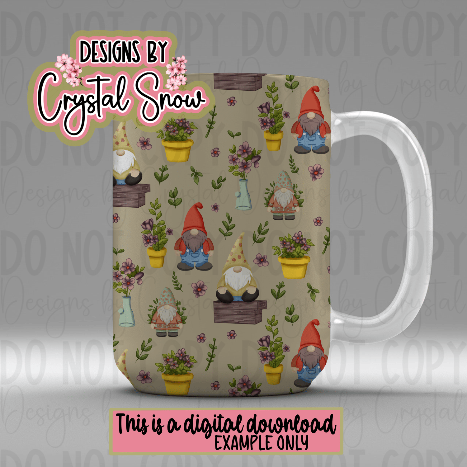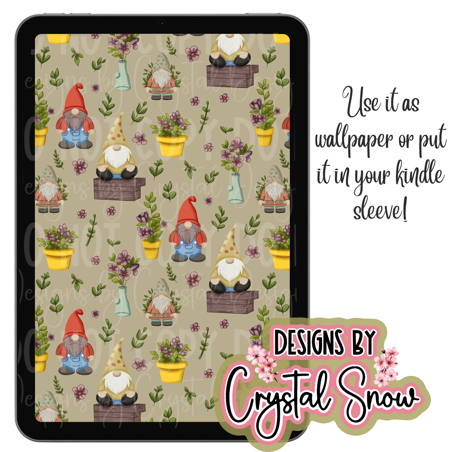 Perfect for digital and print use, this seamless pattern features hand-drawn garden gnomes, flowers, and leafy greenery with both tan and black background options included. Whether you're creating tumbler wraps, stickers, fabric prints, or planner covers, this cozy spring design brings a touch of enchantment to any craft. Designed with a seamless tile, it repeats flawlessly for larger formats or pattern fills in design programs like Canva, Procreate, or Photoshop.