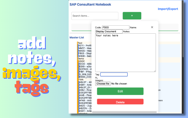 SAP Consultant Notebook is a chrome extension that helps you organize your SAP transaction knowledge through a simple browser interface.