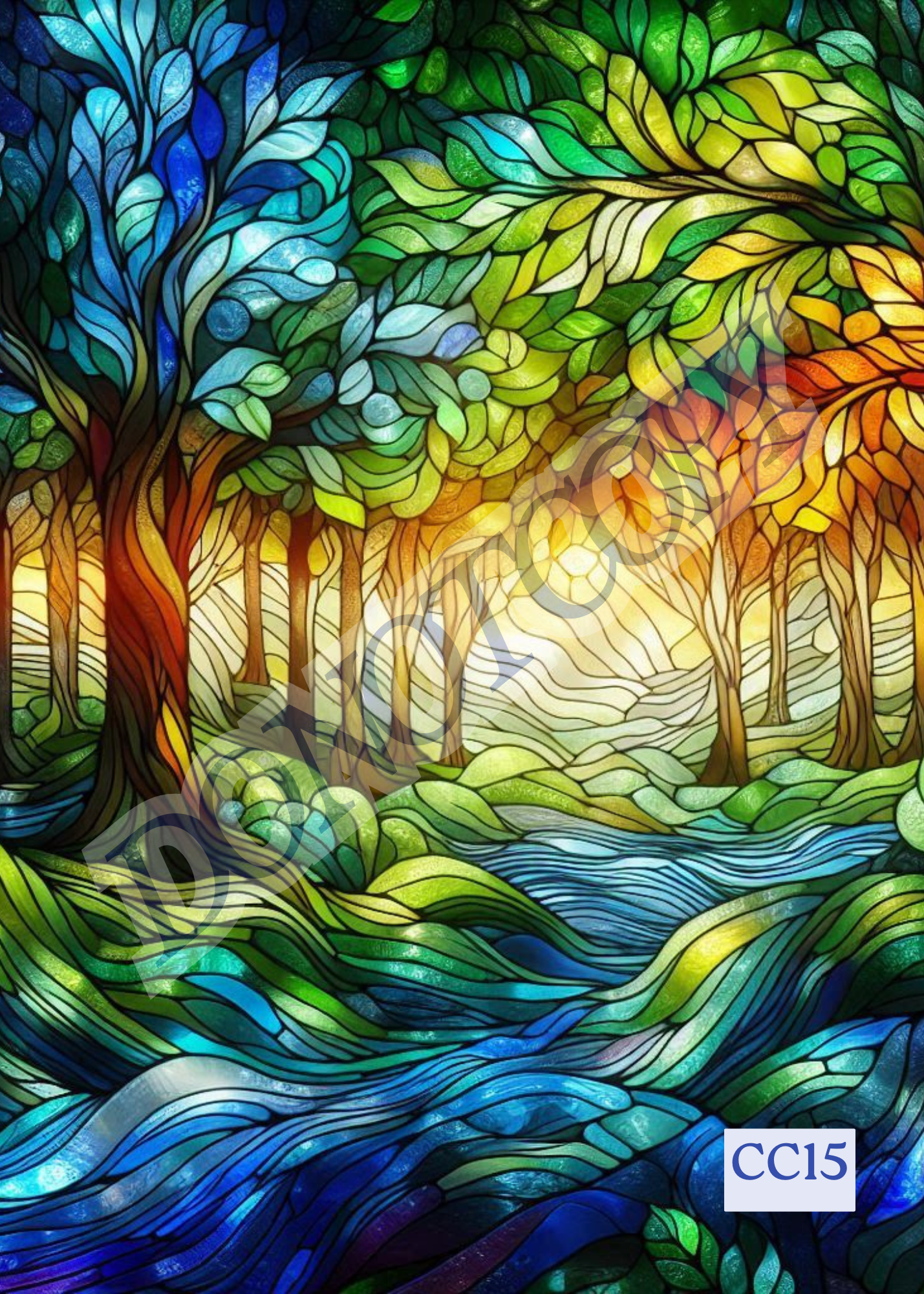 Flow of Light captures a forest alive with energy. A gentle stream winds through waves of green, guiding your eyes toward a radiant glow in the distance. The stained glass effect dances between daybreak and dreamscape, where earth and sky seem to blur. It’s a reminder that even in stillness, life is always moving... and light will always find its way through.