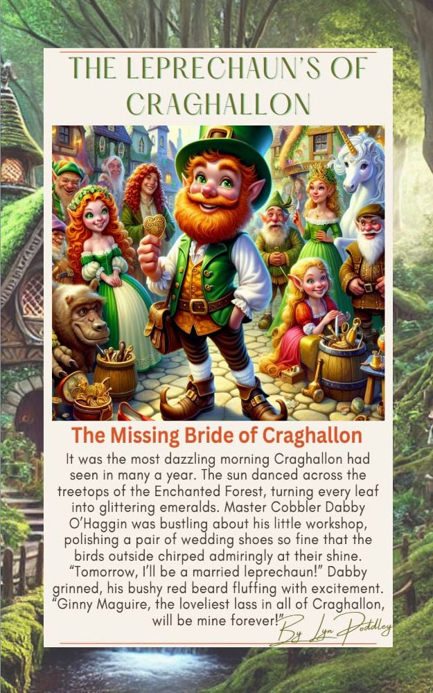 It was the most dazzling morning Craghallon had seen in many a year. The sun danced across the treetops of the Enchanted Forest, turning every leaf into glittering emeralds. Master Cobbler Dabby O’Haggin was bustling about his little workshop, polishing a pair of wedding shoes so fine that the birds outside chirped admiringly at their shine. “Tomorrow, I’ll be a married leprechaun!” Dabby grinned, his bushy red beard fluffing with excitement. “Ginny Maguire, the loveliest lass in all of Craghallon, will be mine forever!”