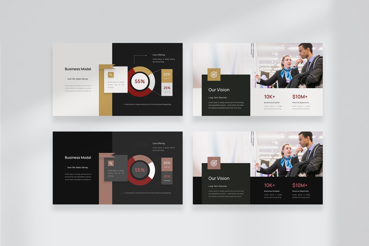 Perfect for pitching ideas, presenting business models, and showcasing growth, traction, and financials in a clear and confident way.