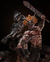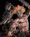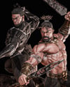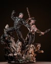 This dynamic dual-statue model captures both warriors in striking, battle-ready poses with intricate suit details and muscular anatomy.