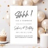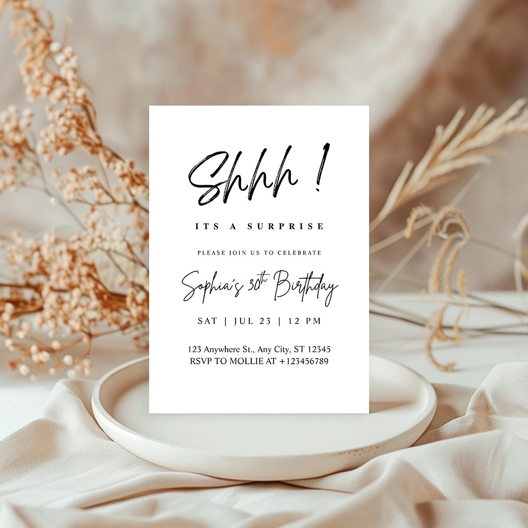 Designed for sophistication and impact, this modern invitation is perfect for planning a stylish surprise celebration of any age — from 18 to 40, 50, 60, 70, 80 and beyond.