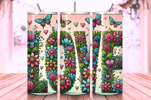 Cute Valentine's Day Tumbler Wrap - 20oz Sublimation Design - Love with Hearts, Butterflies, and Floral Letters - PNG Digital Download - 300 DPI