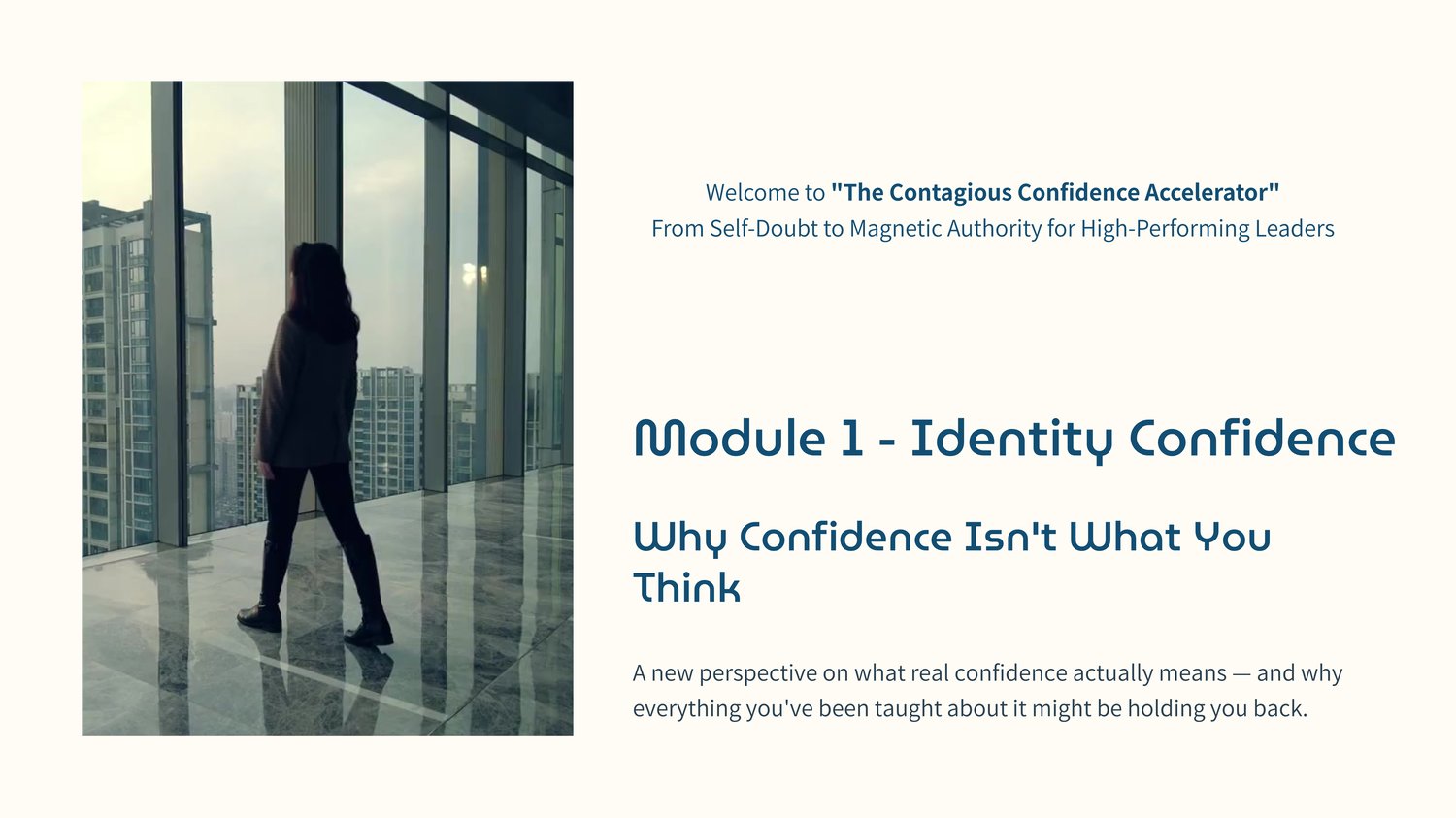 Right now, too many smart, capable people are unconsciously taking on the self-doubt, overthinking, and hesitation of those around them. It’s holding them back in business, relationships, leadership, and life. They’re not lacking talent. They’re lacking visible, embodied confidence — the kind that magnetizes opportunities, commands respect, and inspires others to rise with them. This course exists to change that.