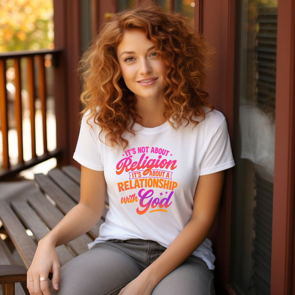 Bring faith to life with this vibrant Christian sublimation design featuring radiant neon hues of pink, purple, orange, and gold. This bold, glowing artwork makes a powerful statement about connection, grace, and relationship over religion.