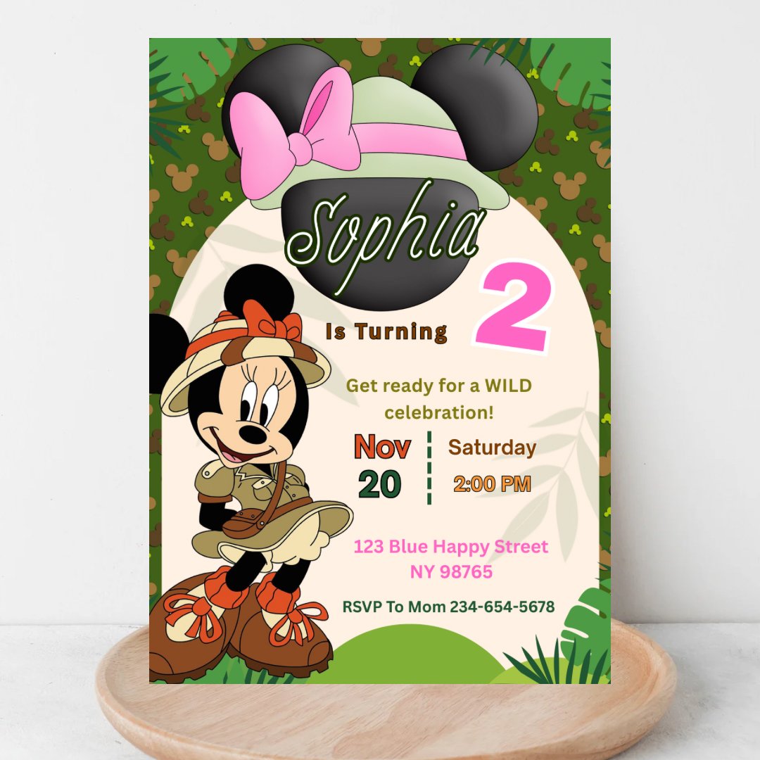 Bring the adventure of the jungle to your little one’s special day with this adorable Minnie Safari Birthday Invitation! 🐒🌿 Perfect for a wild safari-themed party, this editable Canva template allows you to easily personalize all the details — name, age, date, time, and location — in just minutes.