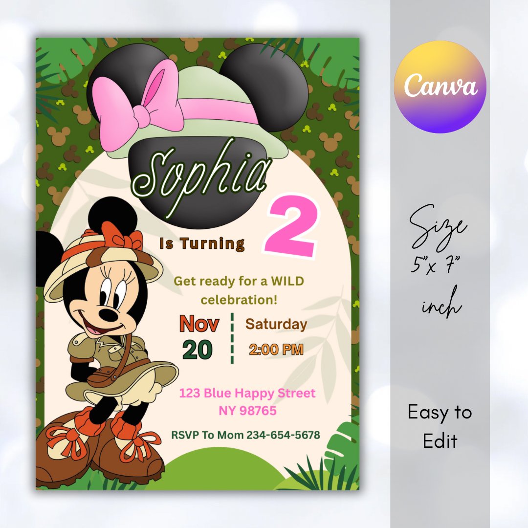 Minnie Safari Birthday Invitation, Editable Canva Template,Jungle Party Invite, 2nd Birthday Invitation