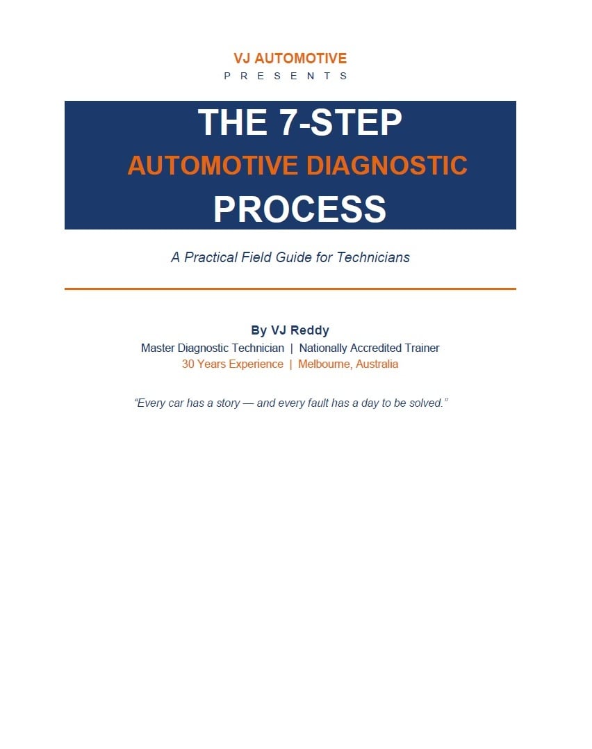 Free download for automotive technicians. The same 7-step diagnostic process used by a Master Diagnostic Technician with 30 years experience across India, Oman, and Australia. Includes a bonus 5W 1H method for come-and-go faults that most workshops can't solve. Used by VJ Automotive to solve faults that three other workshops couldn't find.