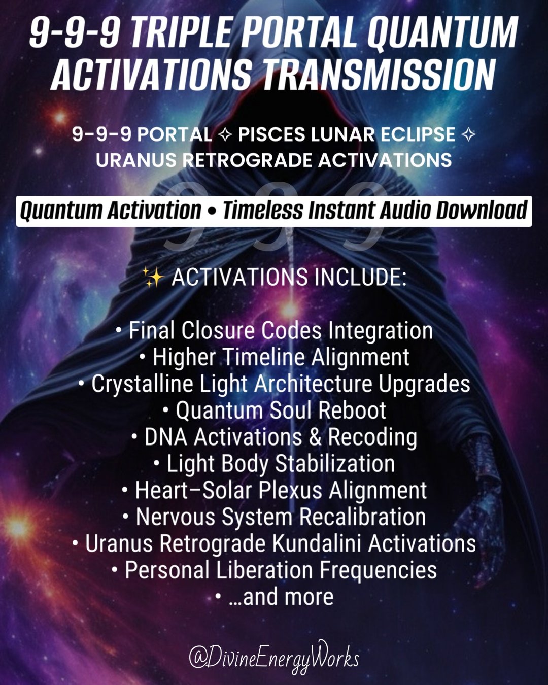 This year’s 9-9-9 Triple Completion Stargate is unlike any other - a once-in-a-decade Alignment, encoded with the 999 Ascension Key of Universal Closure and Completion. Opening just two days after the Total Lunar Eclipse in Pisces and on the heels of the start of the Uranus Retrograde in Gemini, this rare Triple Portal Convergence intensifies the emotional, karmic, and energetic Finality Codes in the Field. Outdated Templates, expired Missions, and overextended contracts are being dissolved, while a Quantum Reboot of Soul Technology installs New Crystalline Architecture across your timelines.