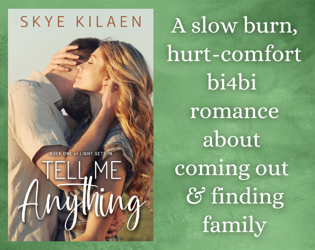 TELL ME ANYTHING is a hurt-comfort, age gap, bi4bi queer M/F romance novel about being closeted in your late 20s and finding a way to come out on your own terms. The story is high angst due to the serious topics of threats and family rejection, but you can also expect a cinnamon roll hero, hot chocolate, caring friends and queer found family, a slow burn mutual crush that turns high heat, and a guaranteed HEA.