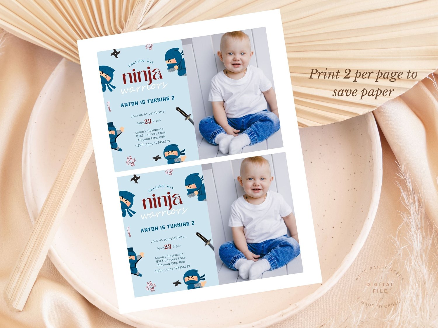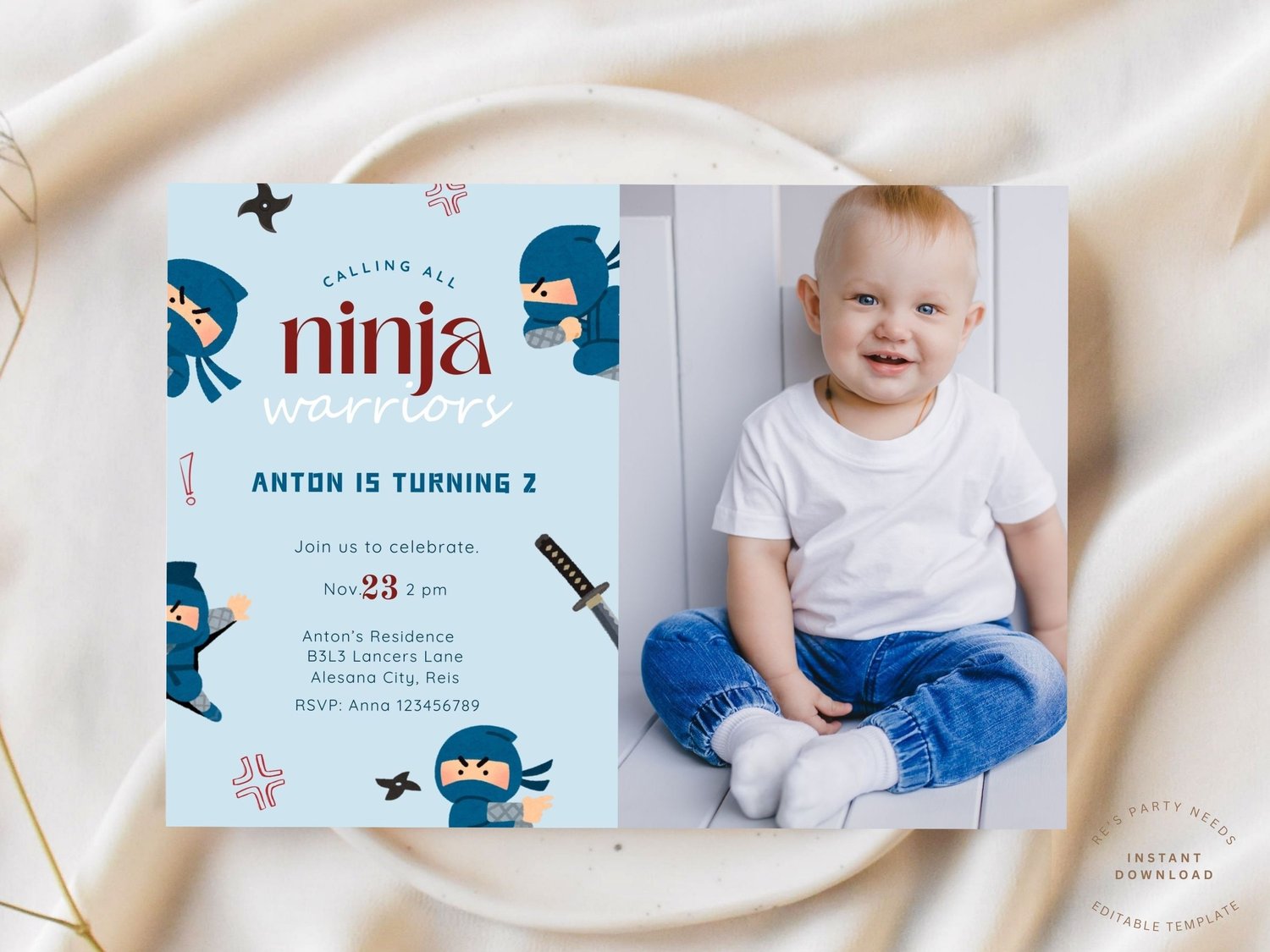 Ninja Warrior Birthday Invitation with Photo, Blue Ninja Party Invite Boy, Calling All Ninjas, Karate Invitation Template with Photo