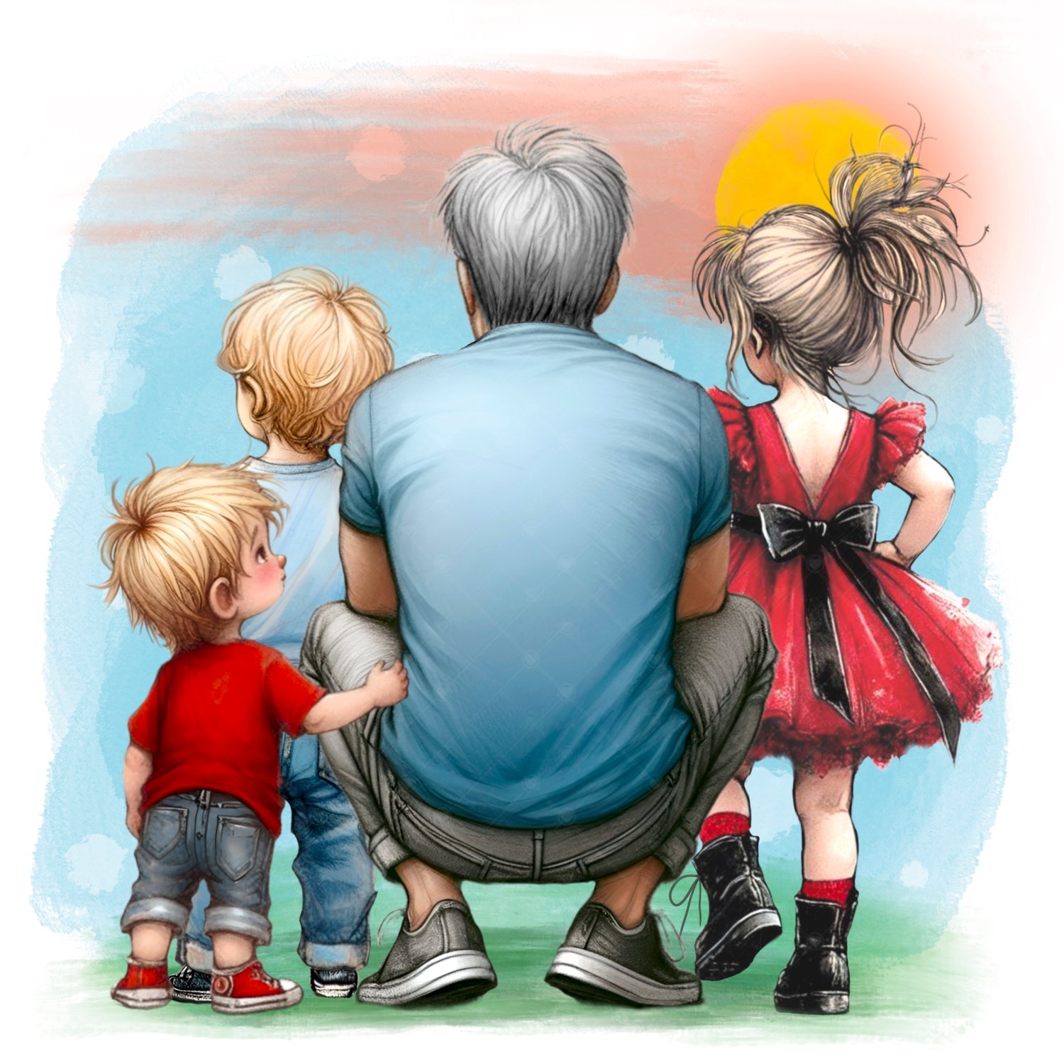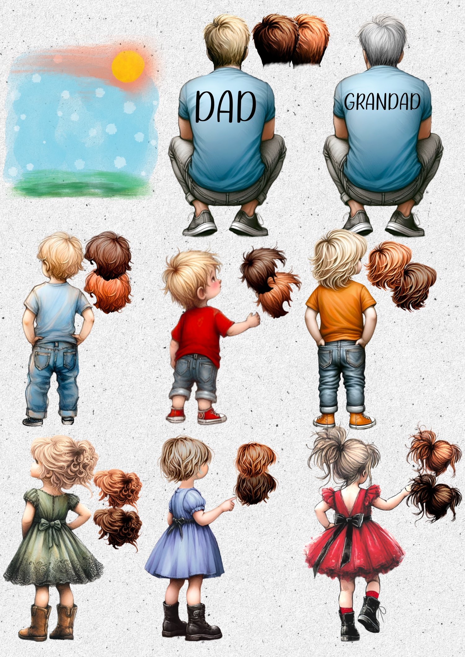 Father, Grandad and children. 23 PNGs. 3 boys, 3 girls. Hair clipart. Separate watercolour background. Sublimation, print. Instant download. Please ensure you are confident in the use of clipart before purchasing. No text or physical products supplied.