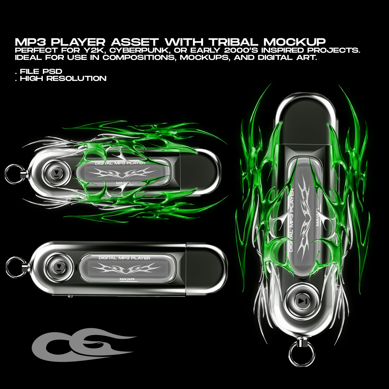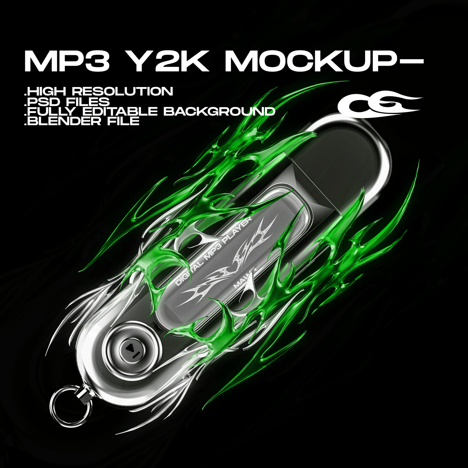 MP3 player with a retro-futuristic design and green tribal flames, perfect for Y2K, cyberpunk, or early 2000’s inspired projects. Ideal for use in compositions, mockups, and digital art.