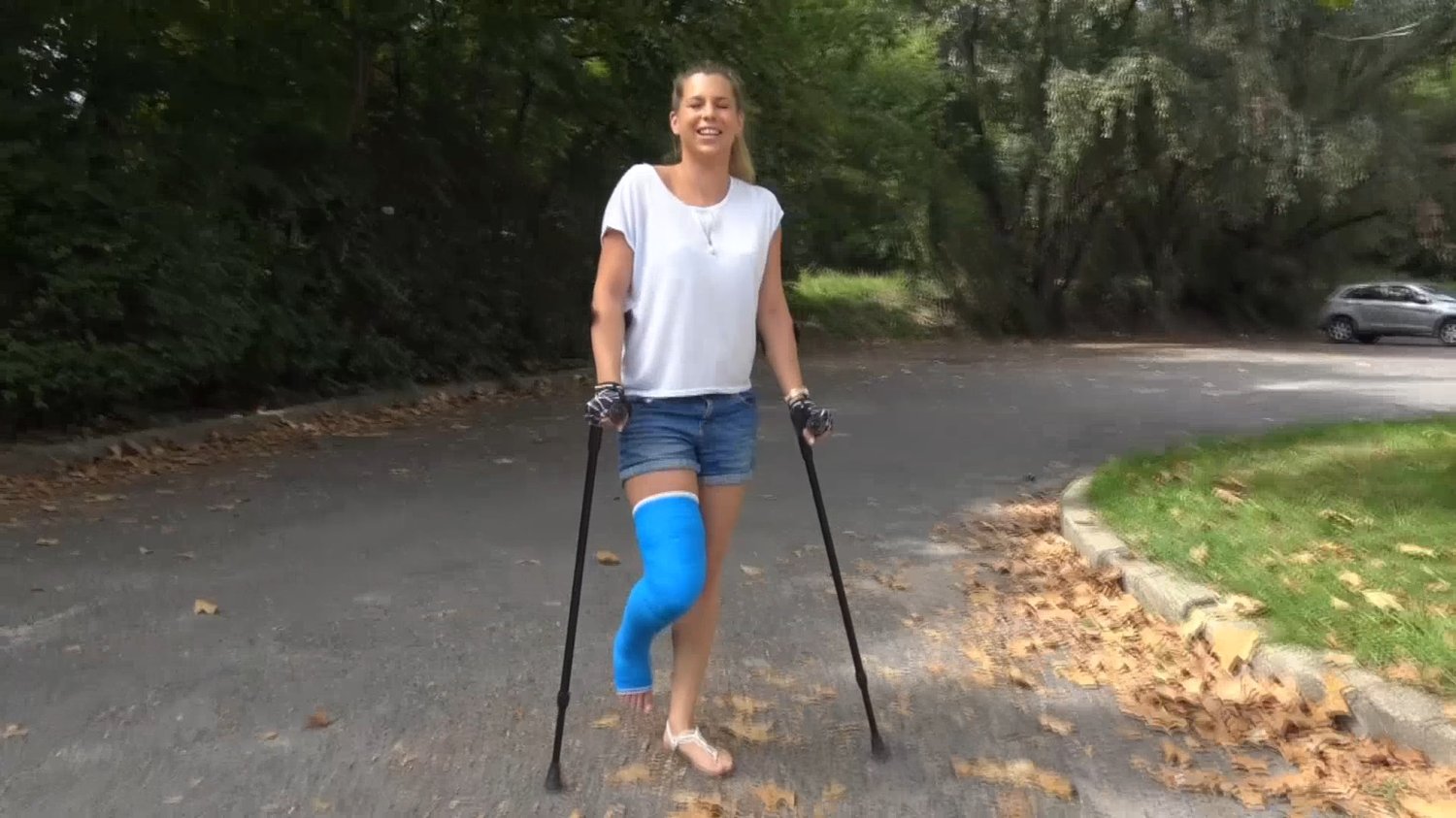 Lizzy is crutching in to a park with her blue bent long leg cast.There is no chance for Lizzy to walk on the leg so she is forced to use crutches.She sit down on a bench to rest and we gets closeups in different angles of her cast.