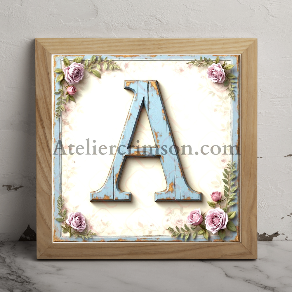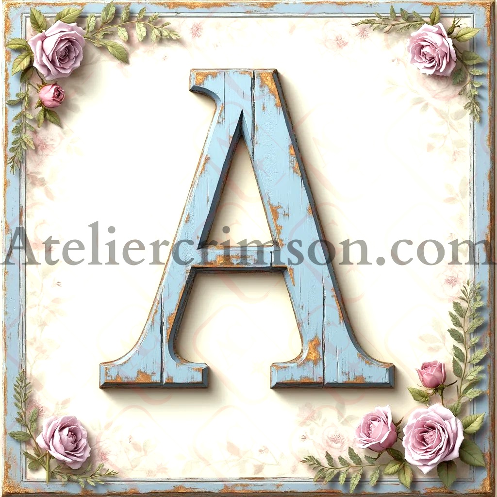 The letter A shabby chic blue a work of art in soft pastel blue. These elegant characters, reminiscent of weathered painted wood, stand out against a delicate off-white background with subtle floral accents. Perfect for vintage-inspired home decor, DIY projects, or creating unique, personalized gifts with a touch of timeless elegance.