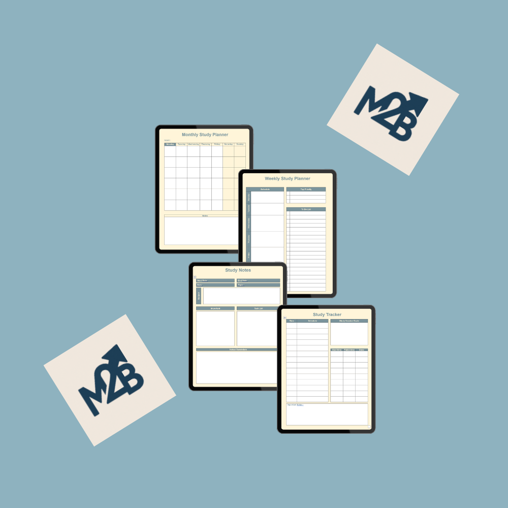Page 4 – Study Tracker Monitor your time and focus with a detailed log of study sessions, goals, start/finish times, and completion status. Includes space for important notes and reflections.