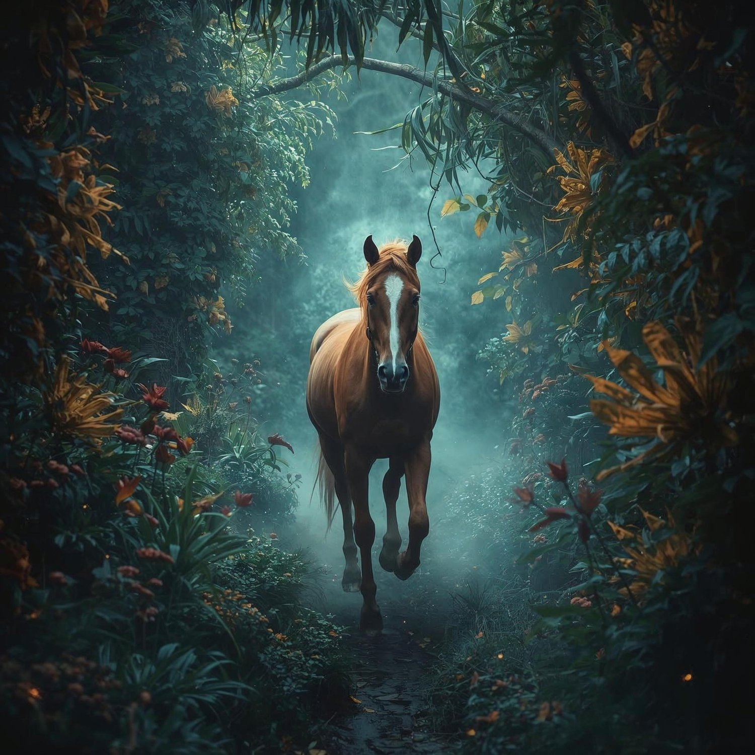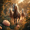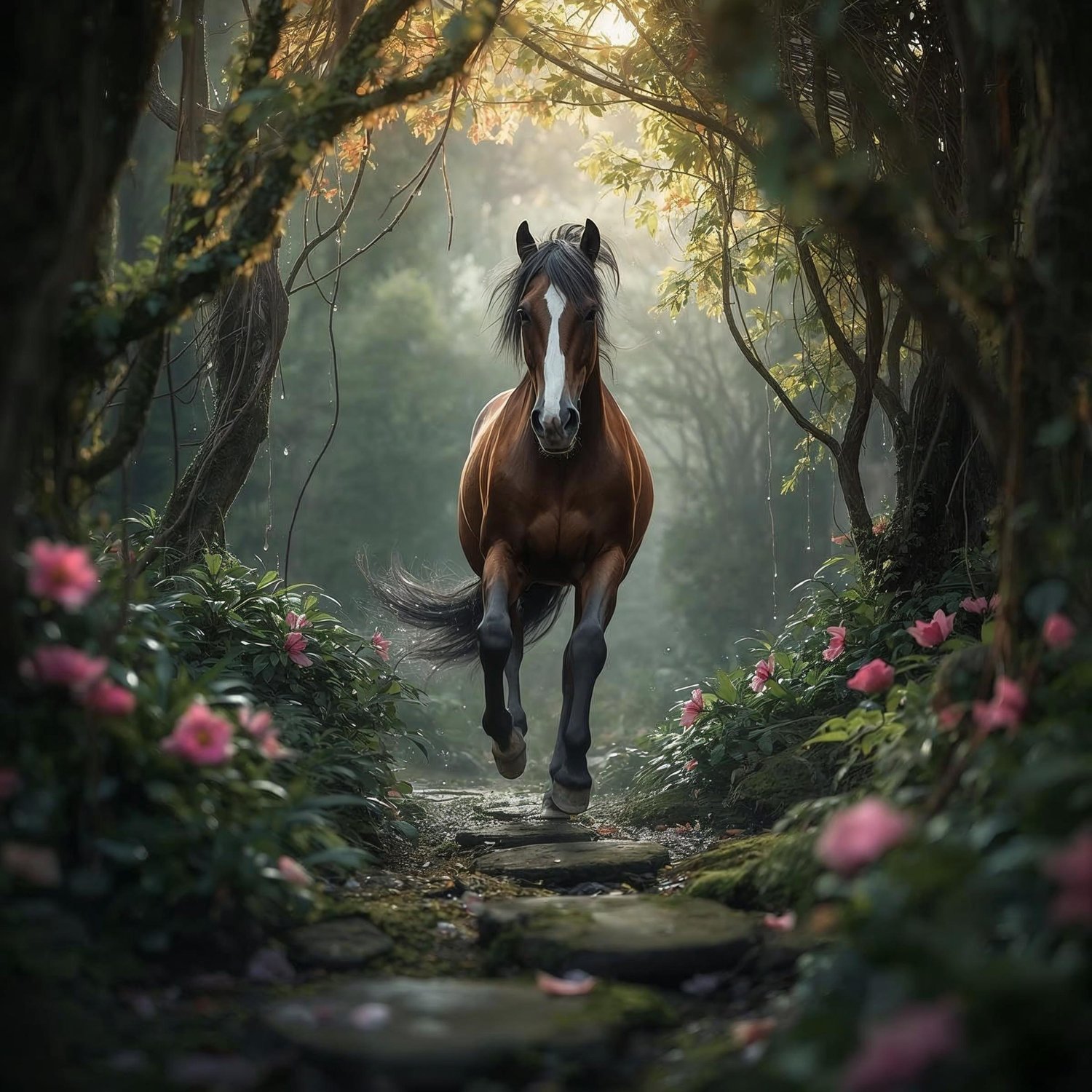 These images of horses running in a garden capture the raw beauty, grace, and energy of these majestic animals in a serene natural setting. Each photograph showcases the powerful movement of the horses, with flowing manes and strong, muscular forms in motion, highlighting their elegance and strength. The lush greenery of the garden provides a vibrant and peaceful backdrop, contrasting perfectly with the dynamic energy of the horses. Soft sunlight filtering through trees adds warmth and depth, enhancing the textures of the horses’ coats and the surrounding foliage. These images evoke a sense of freedom, vitality, and harmony with nature, portraying the horses as symbols of strength, spirit, and beauty. Perfect for wildlife, nature, or equestrian-themed photography, the images celebrate the connection between animals and their environment, capturing fleeting moments of speed, grace, and natural splendor that leave a lasting impression on the viewer.