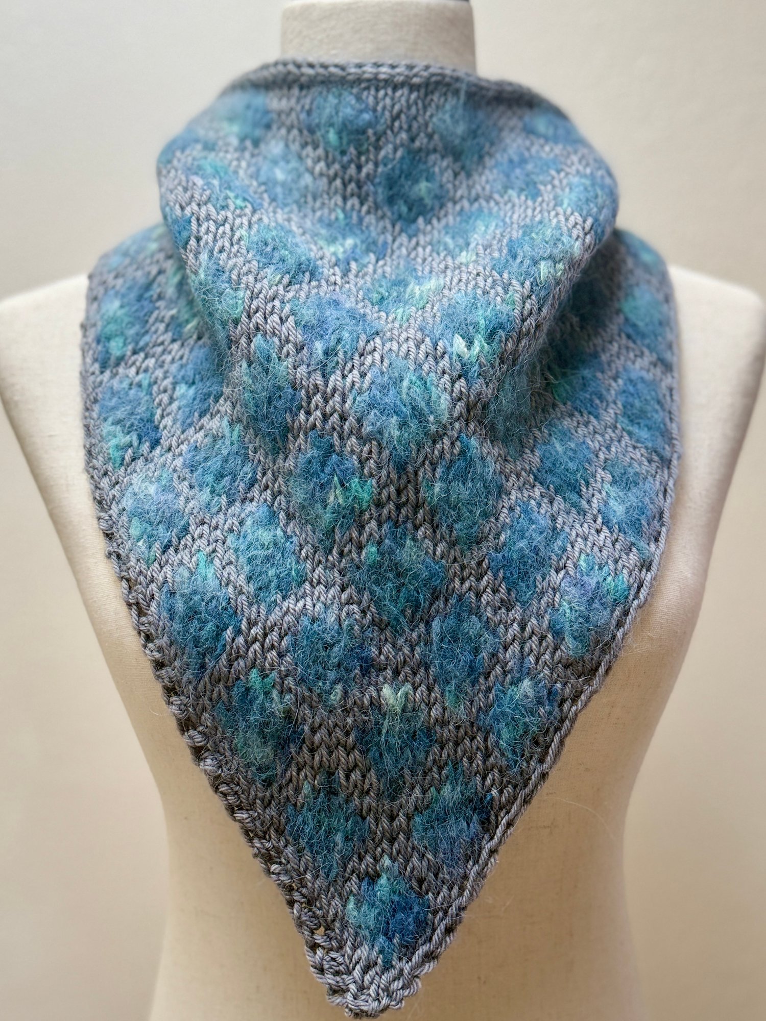 Create a cozy and stylish triangular cowl using beautiful two-color Tunisian crochet colorwork. This pattern is designed to showcase the stunning texture of fuzzy/fluffy yarns!