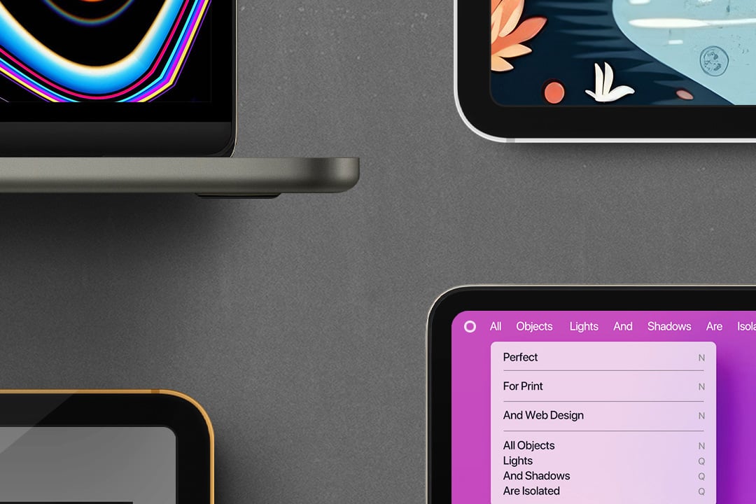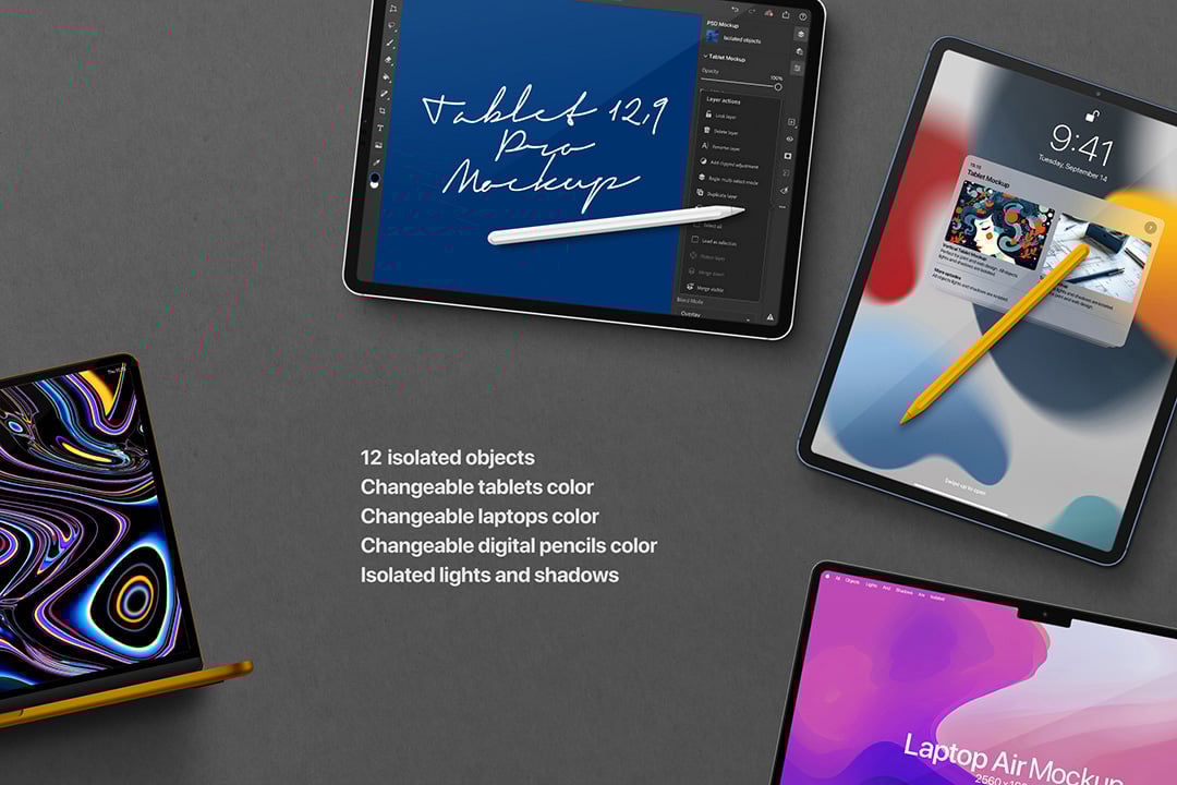 High-resolution PSD mockup set with three MacBook Air laptops, eight iPad Pro 12.9 tablets and an Apple Pencil, editable lights & shadows via Smart Objects.