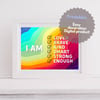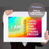 Self-affirmation, positivity, self-love, confidence, inspirational, empowering, vibrant colors, rainbow background, bold text, affirming adjectives, loved, brave, kind, smart, strong enough, checkboxes, inner strength, emotional well-being, motivational, self-acceptance, personal growth.