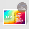 In a vibrant tapestry of colors blending seamlessly like a rainbow, bold white letters declare ‘I AM,’ followed by affirmations of being ‘LOVED,’ ‘BRAVE,’ ‘KIND,’ ‘SMART,’ and ‘STRONG ENOUGH.’ Each word is a testament to self-love and inner strength, with checkboxes proudly marked, symbolizing the completion of a journey towards self-acceptance. This image radiates positivity and the romantic notion of embracing one’s true self amidst a spectrum of life’s beautiful hues