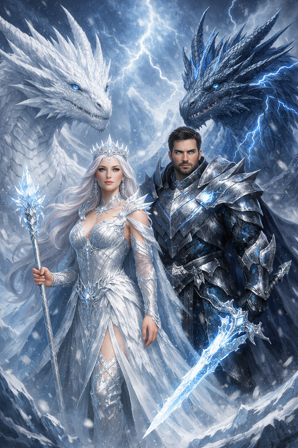Bathed in luminous ice-blue and crystal white tones, the Celestial Ice Queen radiates elegance and divine calm, while the Storm Ice King commands the tempest with lightning-infused authority. Towering blue and white dragons coil around them, symbolizing loyalty, protection, and raw elemental magic.