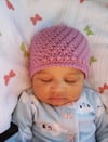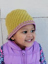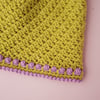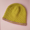 An easy top down beanie featuring swirling shells and a cute border accent that can be done in a differen color.