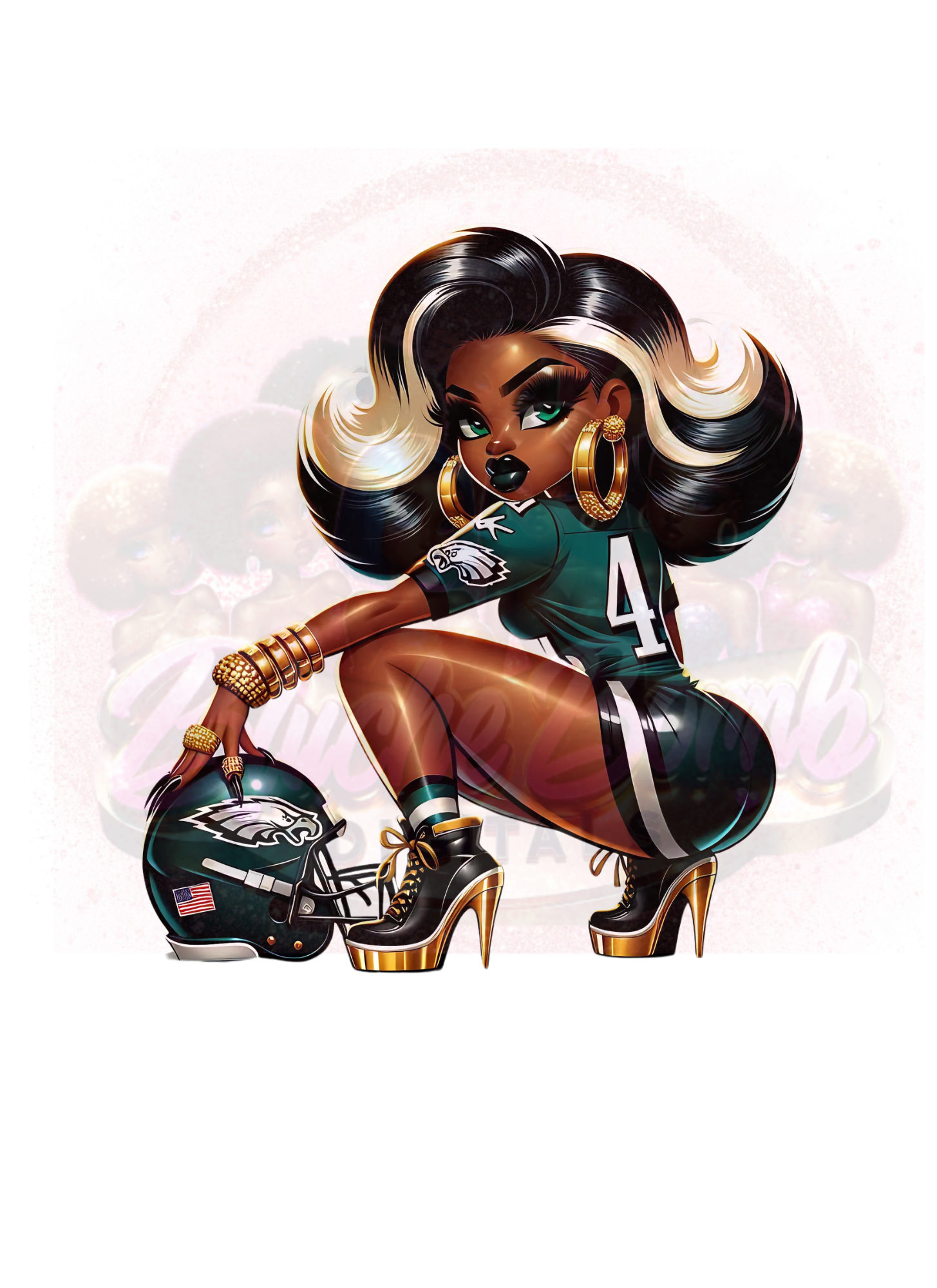 This high-quality PNG design showcases a bold, glamorous Afro-chic Eagles football fan rocking vibrant game-day attire with a unique, retro-inspired style. Featuring a dynamic pose, intricate details, and rich colors, this artwork is perfect for celebrating team spirit in style. Whether you're a Eagles fan or love stunning sports-themed artwork, this design is a showstopper!