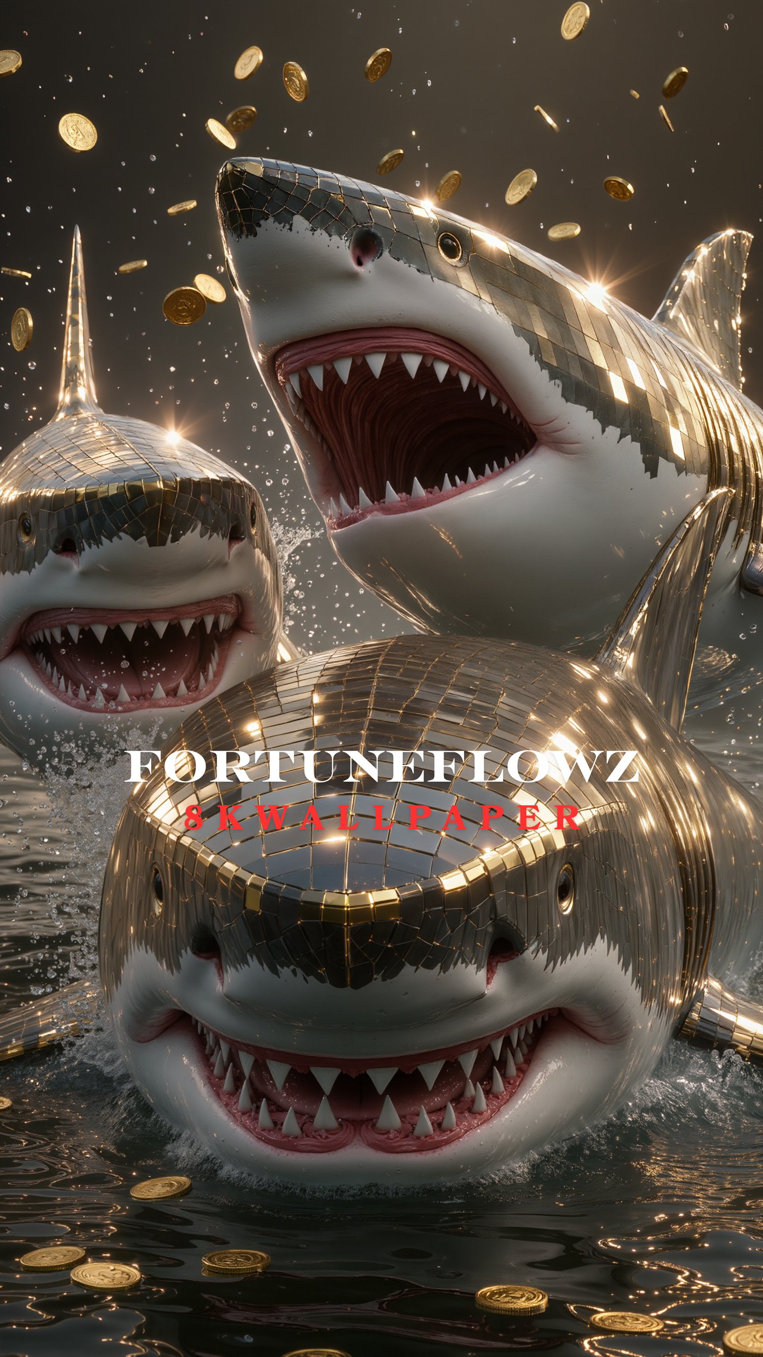 Golden Prosperity Sharks – Wealth Surge Edition (8K Phone Wallpaper)