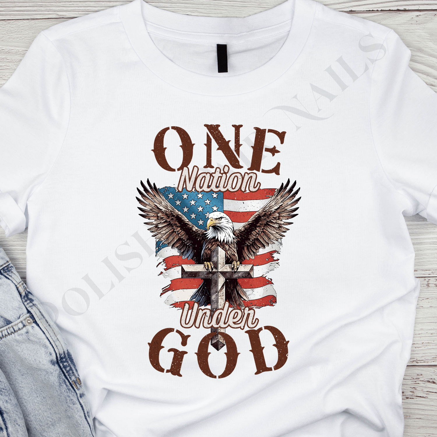 how your faith and patriotism with this powerful 'One Nation Under God' t-shirt! This striking design features a bold eagle with outstretched wings perched on a cross, all set against a distressed American flag. The words 'ONE Nation' and 'Under GOD' complete this meaningful statement.