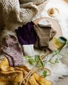 Purl Soho, Knitting Yarn (100% Merino, 219 yds / 200 ms / 100 grams) in Heirloom White and Purple Prune. Shown in Adult Large.
