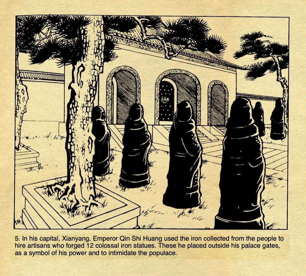 5. In his capital, Xianyang, Emperor Qin Shi Huang used the iron collected from the people to hire artisans who forged 12 colossal iron statues. These he placed outside his palace gates, as a symbol of his power and to intimidate the populace.