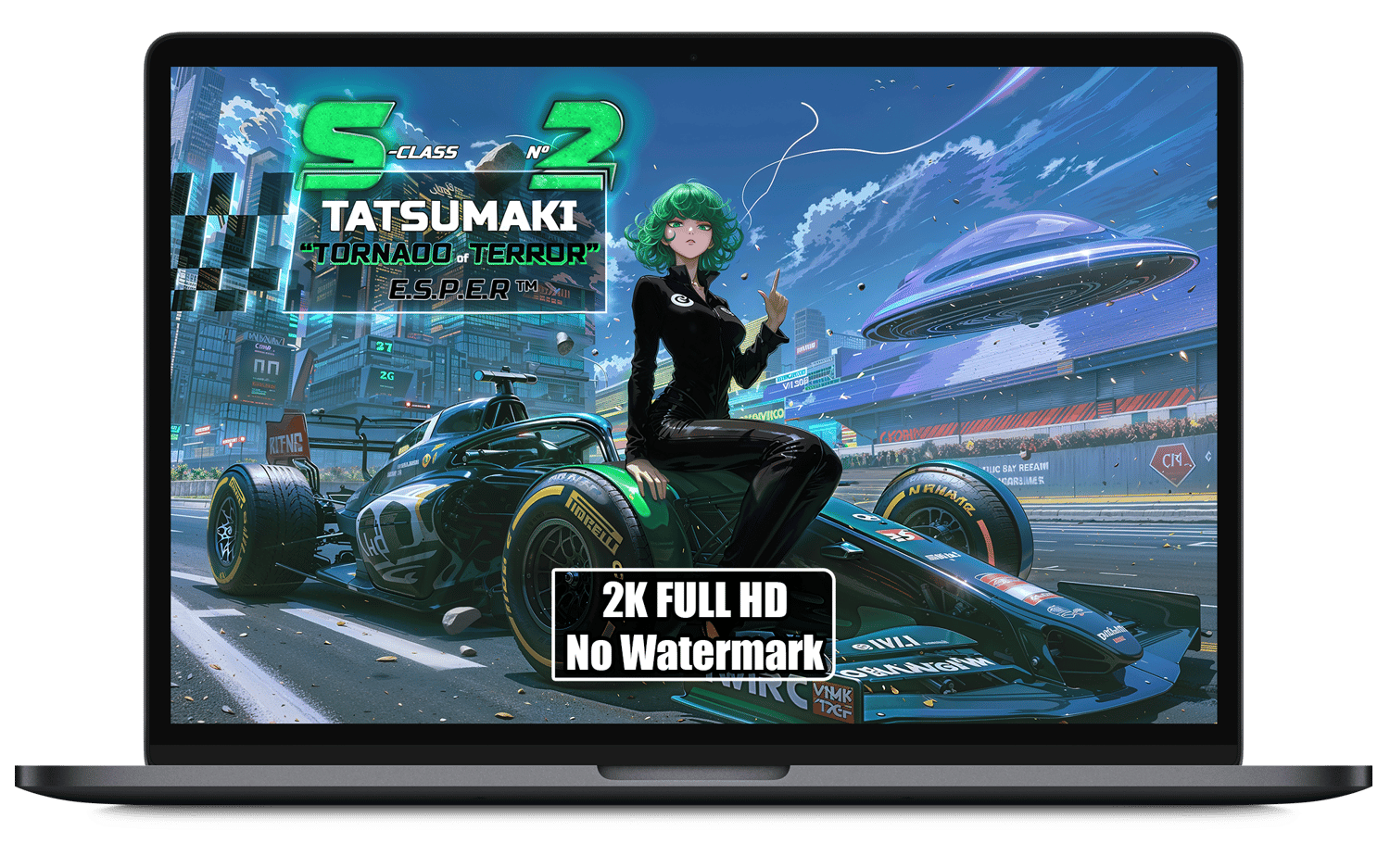 In this dramatic scene, Tatsumaki stands at the apex of a futuristic Formula 1 circuit, swirling a telekinetic storm around her racing machine. Her green hair flows while shards of debris levitate under her psychic control, capturing her powerful presence.